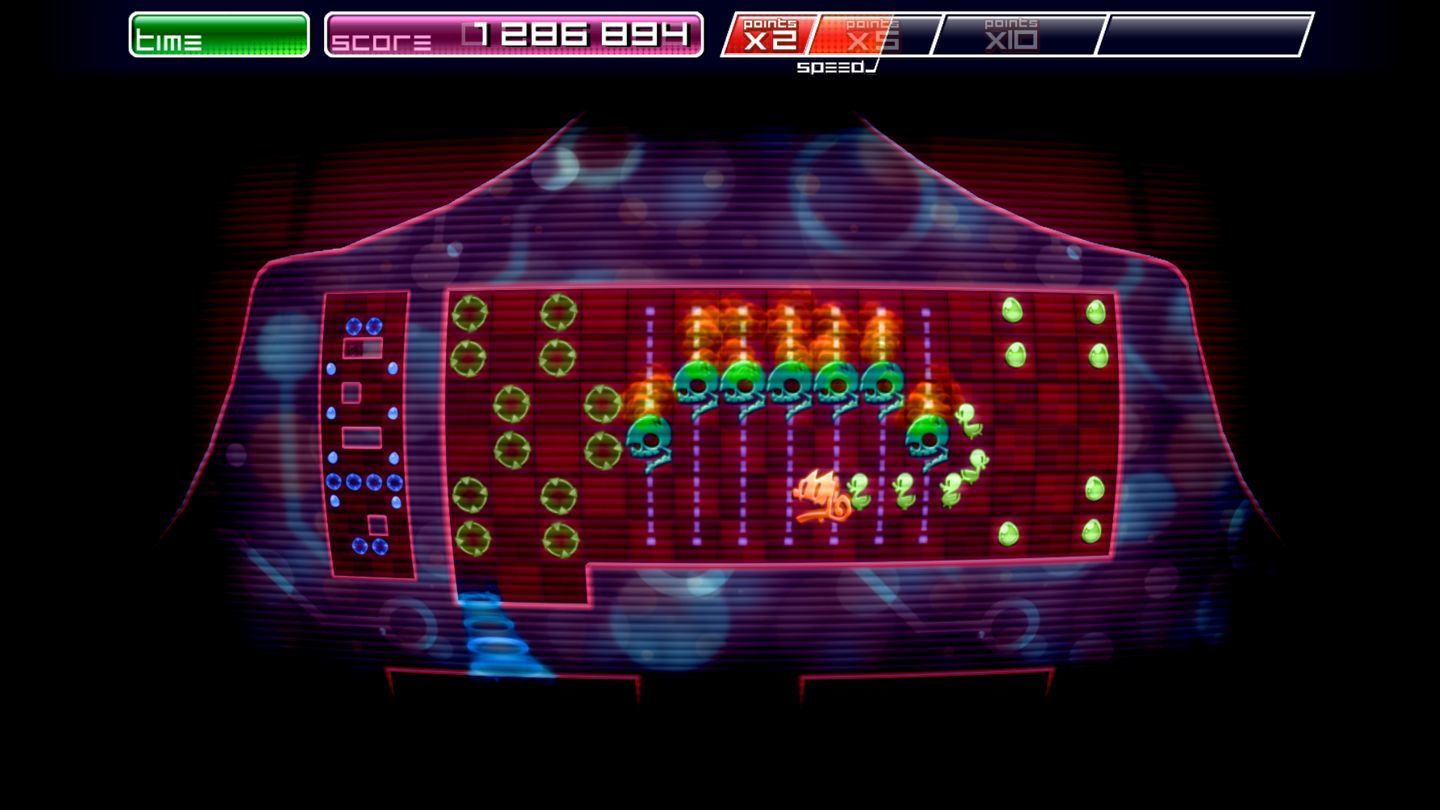 Pastagames nos presenta un juego de aspecto retro muy ochentero, no anticuado en el sentido de gráficos descuidados que ahorran trabajo –el pixelart mal entendido-, sino más inspirado en la renovación de Pac-Man con Championship Edition y sus laberintos de neón. Porque de eso va el juego: recorrer laberintos y conseguir puntos dentro de un tiempo establecido. La fórmula tiene unos cuantos giros para no ser un mero clon de la mascota de Namco, y es que esta vez vamos recorriendo el tablero en busca de unos huevos que eclosionan una vez pasamos por ellos.