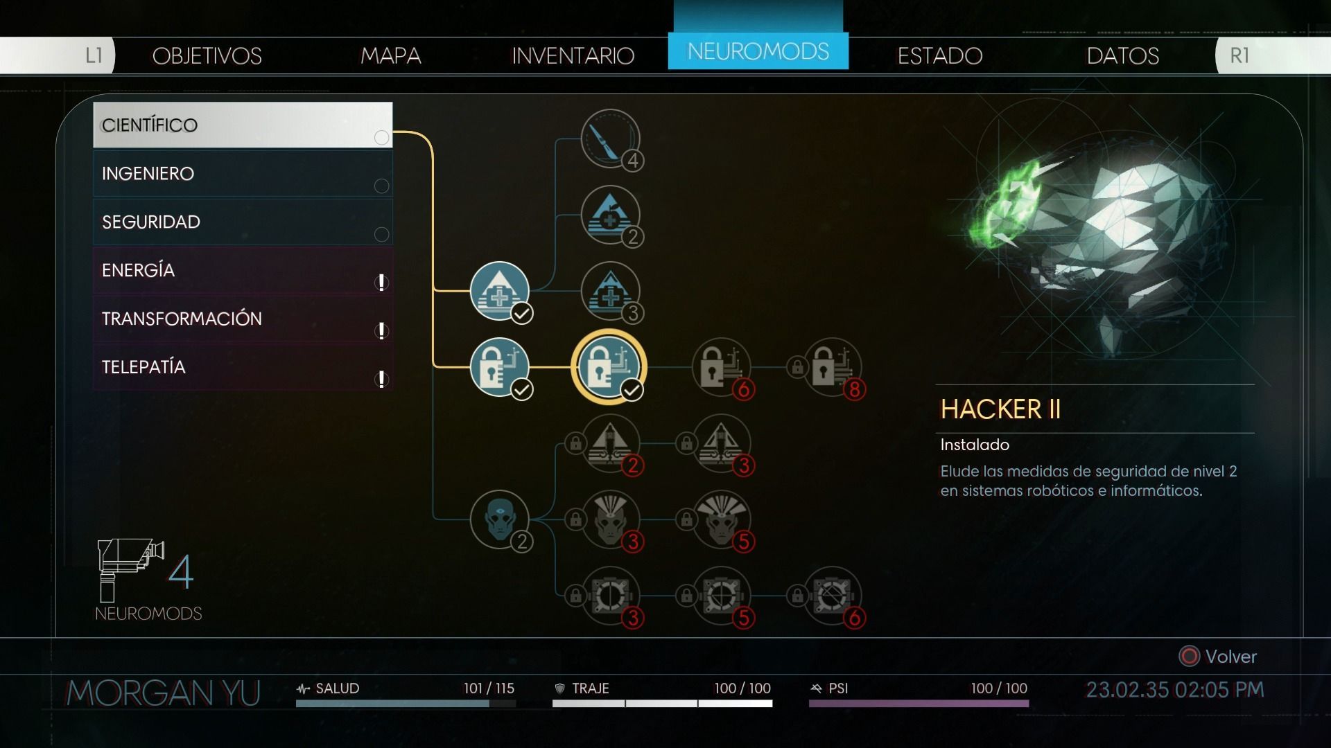 Además de distintas armas y herramientas bastante peculiares, recogiendo o creando neuromods mejoramos las habilidades "humanas" (más fuerza, resistencia, capacidad del inventario, levantar objetos más pesados, piratear o arreglar dispositivos), y llegado a un punto de la aventura obtenemos el psicoscopio, una herramienta con la que podemos escanear a los enemigos, y así aprender sus poderes. A partir de este momento tenemos que pensar mucho en cómo gastamos los neuromods, si en habilidades humanas o en poderes alienígenas, y esto tiene un gran impacto en el desarrollo del juego, tanto en lo jugable como en lo argumental.