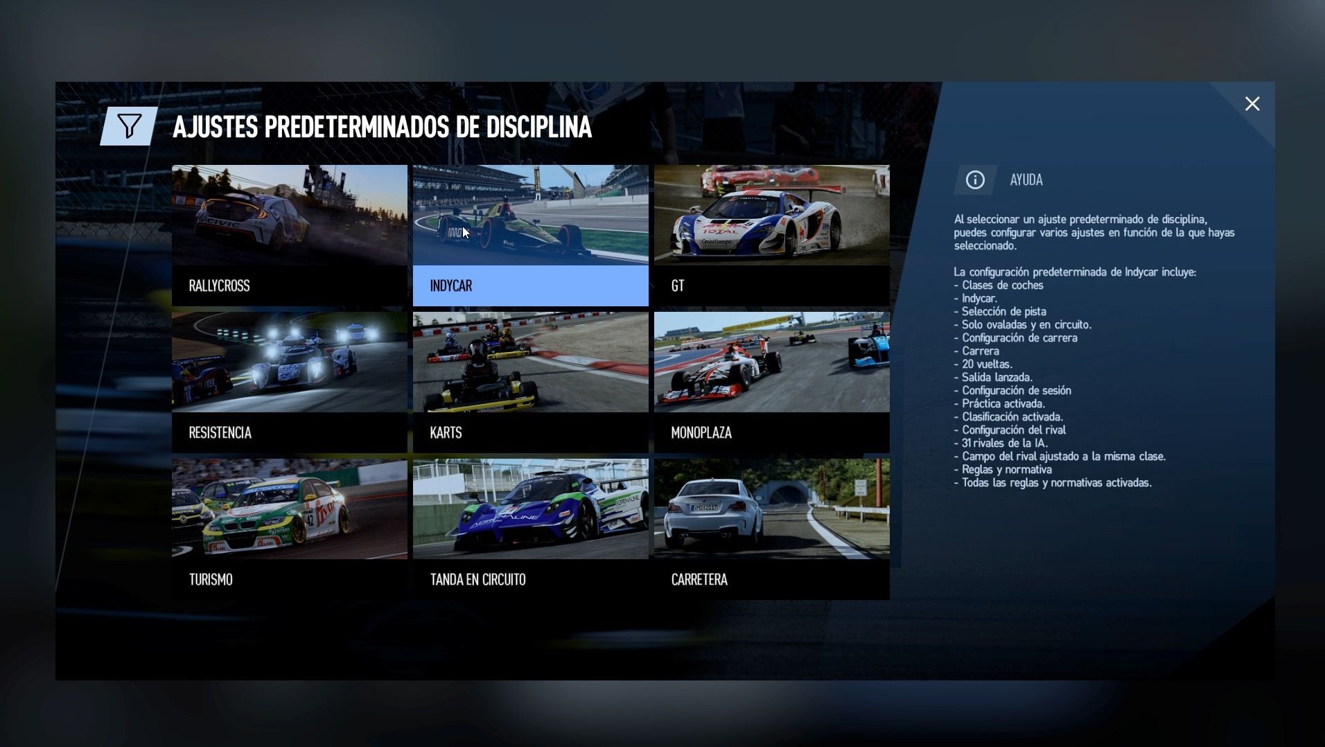 Para hacer la propuesta todavía más ambiciosa, el título incorpora un total de nueve categorías diferentes: Rallycross, Indycar, Gran Turismo, Resistencia, Karts, Monoplaza, Tanda en Circuito, Carretera y Turismo. Cada una de ellas contará con sus propias reglas (incluyendo vueltas de formación, salidas lanzadas, sistema oficial de sanciones, paradas en boxes…) y un control adaptado perfectamente a las características de los vehículos y trazados, destacando la nueva disciplina rallycross, donde encontramos un pilotaje más agresivo y dinámico.