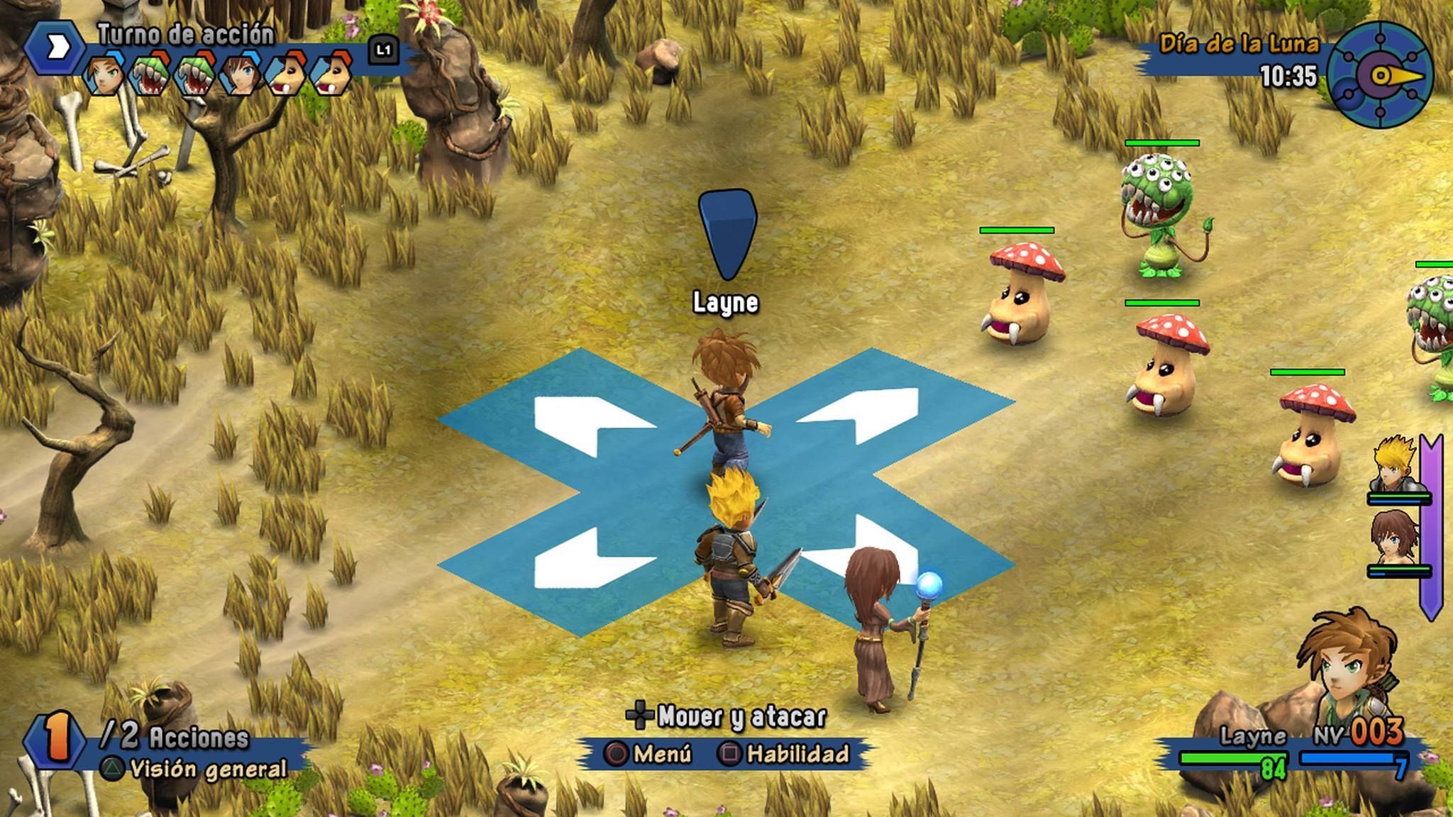 Lo que sí se ha hecho es pulir detalles respecto a su predecesor para que sea más cómodo de controlar, y por ejemplo ahora el desplazamiento en las casillas y el ataque se hace sencillamente con la cruceta o la palanca, sin necesidad de abrir comandos; este menú se reserva para las tareas menos habituales –objetos, escapar, etc.-, lo cual agiliza las acciones que más vamos a repetir.