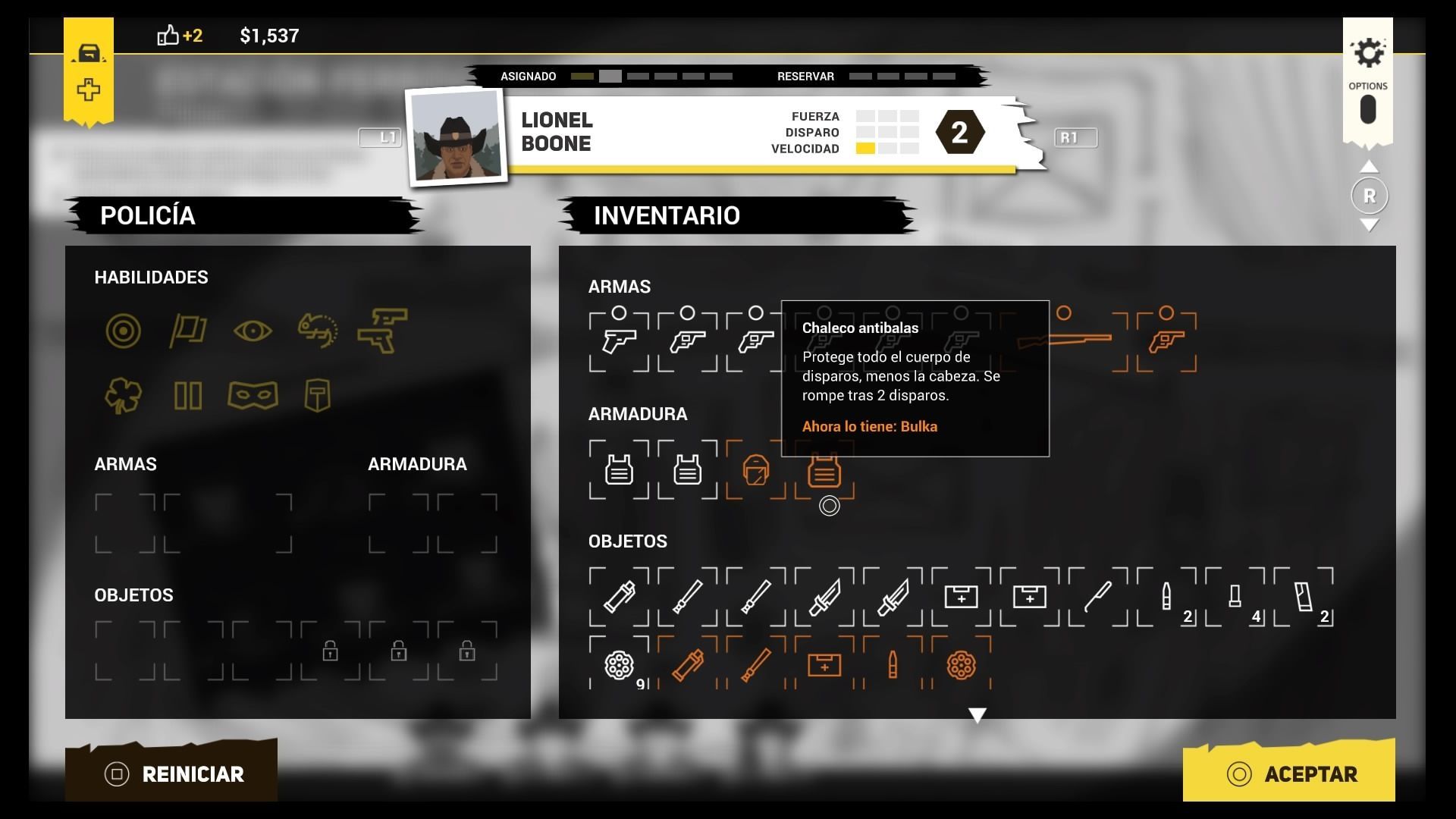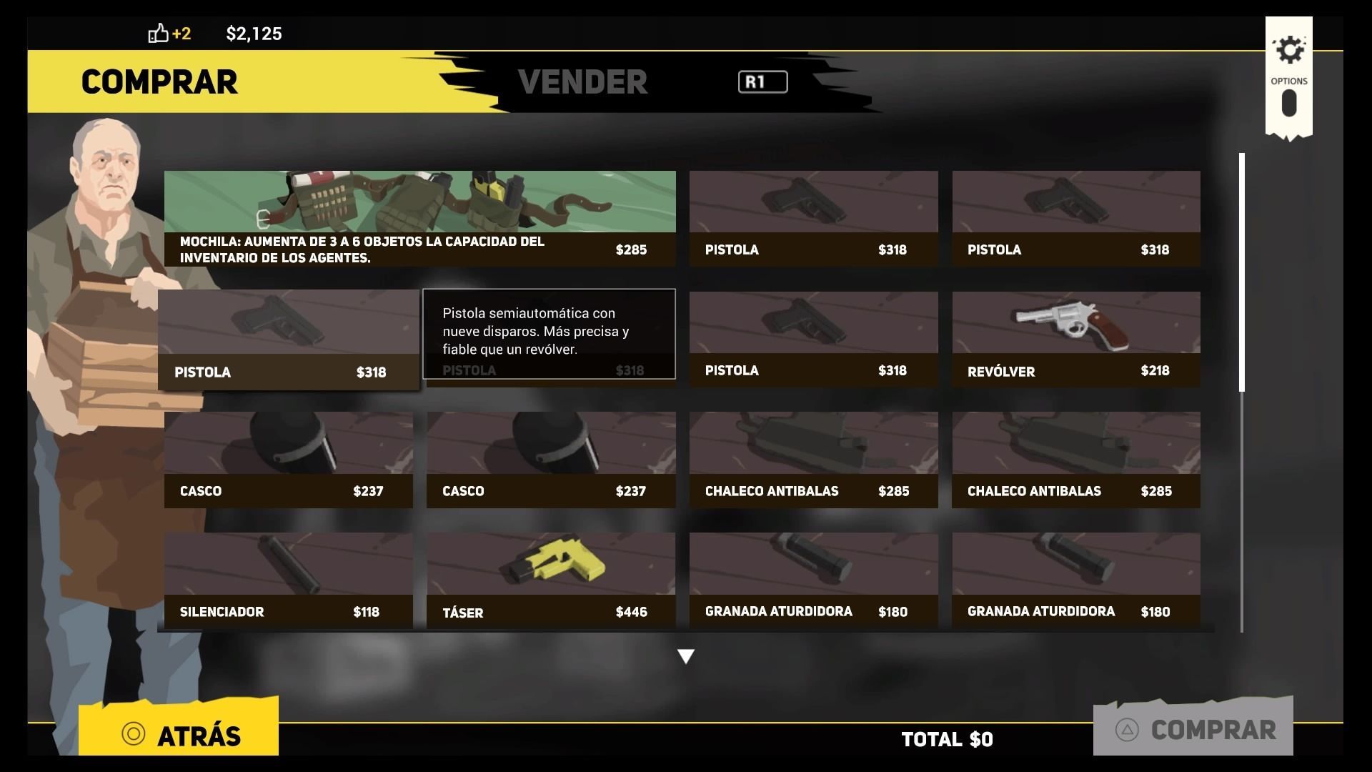 Como os decíamos, tenemos recursos limitados, y cada bala cuenta. En casi cualquier otro juego podríamos desperdiciar balas contra los criminales que se nos crucen por el camino, porque siempre volvemos a la comisaría y al polvorín y nos nutrimos de munición. Rebel Cops nos propone otro planteamiento, y la gestión de recursos es vital. A veces es mejor usar el sigilo y dejar inconsciente a alguien que matarlo, e incluso, en determinadas misiones, el título nos invitará a ello a través de objetivos adicionales. ¿Hay dinero para comprar armas o equipos? Claro, lo hay, y podemos acceder a mejores armas, objetos y enseres vitales mediante un puñado de dólares en el mercado negro, pero os advertimos: son bienes preciados y muy caros.