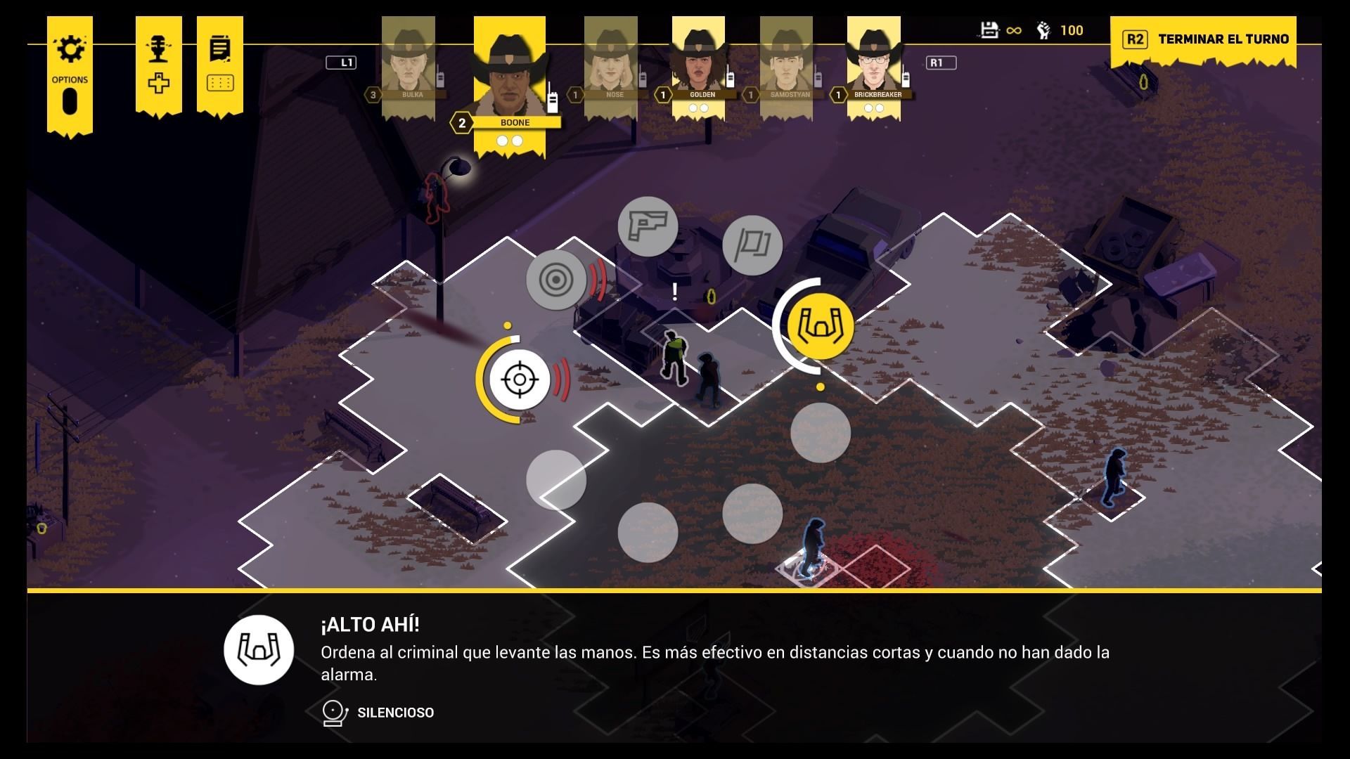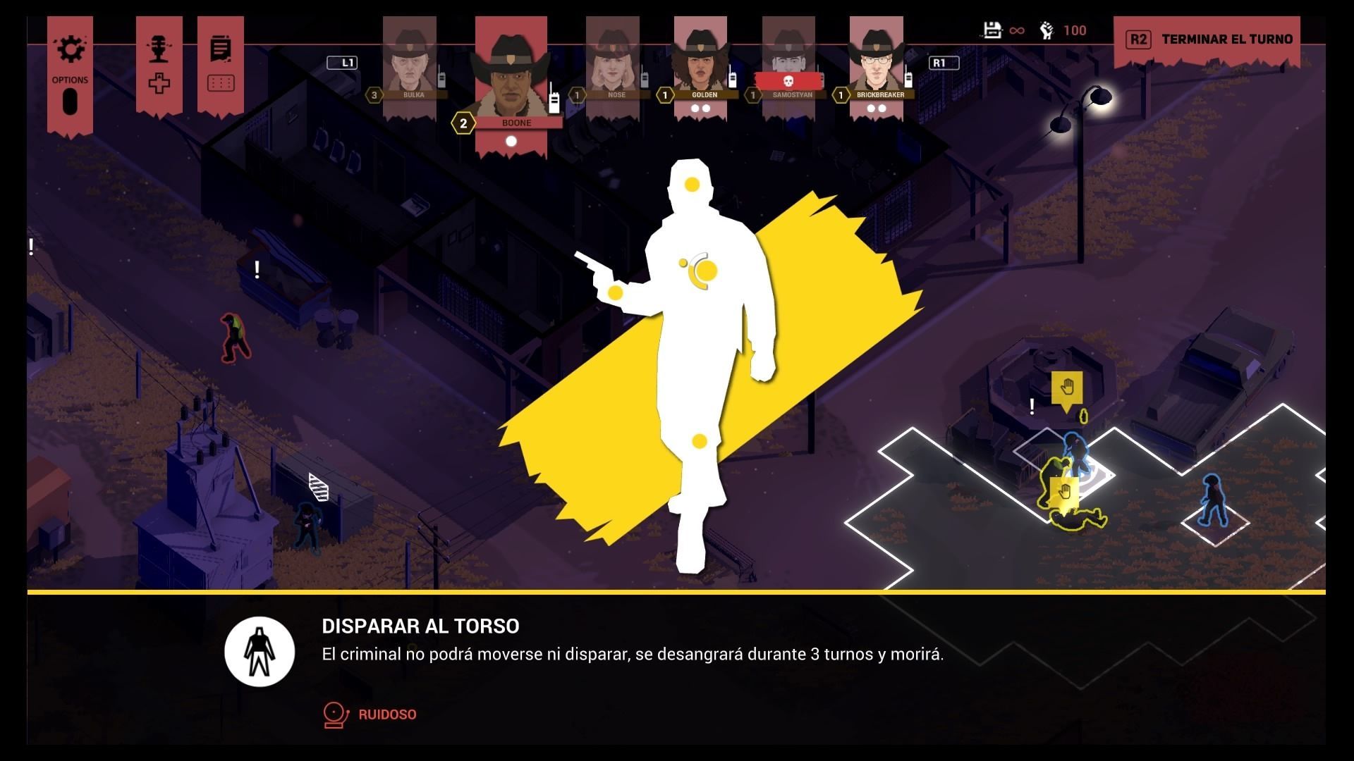 En términos de interfaz apreciamos un refinamiento con respecto a las anteriores obras del estudio. No es que existan demasiadas diferencias, pero si vemos los menús y los textos más claros, fáciles de entender, aunque nosotros nos hemos encontrado con algún que otro momento de desconcierto manejando a nuestras tropas con un mando de PlayStation 4. A veces, acciones como abrir una puerta o ventana o incluso curar a un compañero que está al lado, necesita de un menú contextual que únicamente se abre cuando posamos el cursor de forma milimétrica y muy exacta. No es algo especialmente grave, pero sí puede llegar a desesperar porque en algunas circunstancias el margen para activarlos es muy reducido. Rebel Cops está traducido al español a nivel de textos.