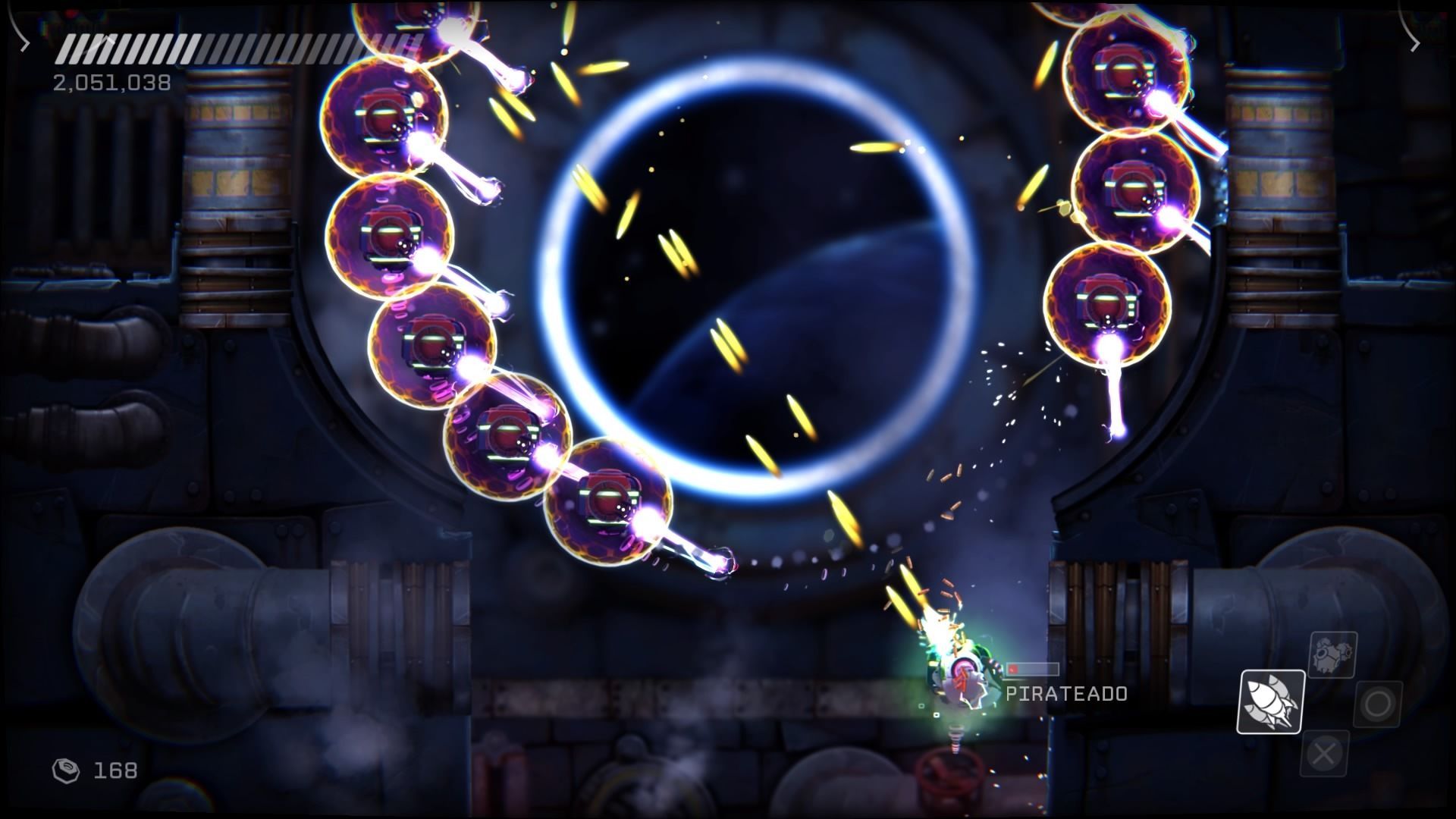 Y a esto que acabamos de contaros se suman otros muchos ingredientes más, como por ejemplo la posibilidad de ir mejorando la capacidad de nuestra nave. Usando los restos que dejan tras de sí los rivales es posible ir adquiriendo desde blindaje adicional para nuestra aeronave a mejoras ofensivas como misiles, descargas, bombas y demás. Y por otra parte también es necesario afrontar secciones plataformeras, jefes finales y, lo más llamativo de todo, también es posible usar la herramienta de hackeo de la nave para usar drones de curación o torretas que nos acompañarán allí donde vayamos.