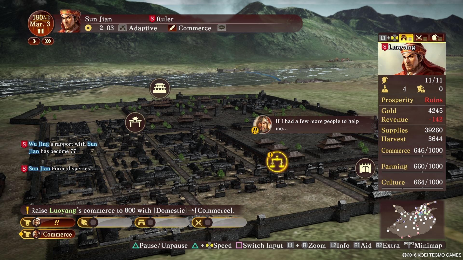 Una vez cerrada esta cuestión debemos atender todas las demás, pudiendo mejorar los asuntos domésticos de la ciudad (Cultivo, Comercio y Cultura), que nos hacen ganar oro y víveres, aumentar la población, la prosperidad o adquirir mejoras tecnológicas. En el plano militar podremos Entrenar (da acceso a nuevas y mejoradas clases de tropas, tales como Infantería del Este o Caballería del Tigre), Patrullar (aumenta la seguridad para recibir más visitas) o Desplegar tropas. El resto de opciones van desde acuerdos (Alianzas, Deudas, Intercambio de recursos, Alto el fuego…) y medidas estrategas (Espionaje, Investigación) hasta las relaciones personales (Asignar cargos, visitar a conocidos y estrechar lazos, hacer obsequios, contratar oficiales, engatusar, pedir lecciones, cartas de presentación …). En la ciudad también podremos comprar y vender o llegar a organizar banquetes, y se nos facilita en todo momento un esquema del sistema de vínculos con cada personaje.