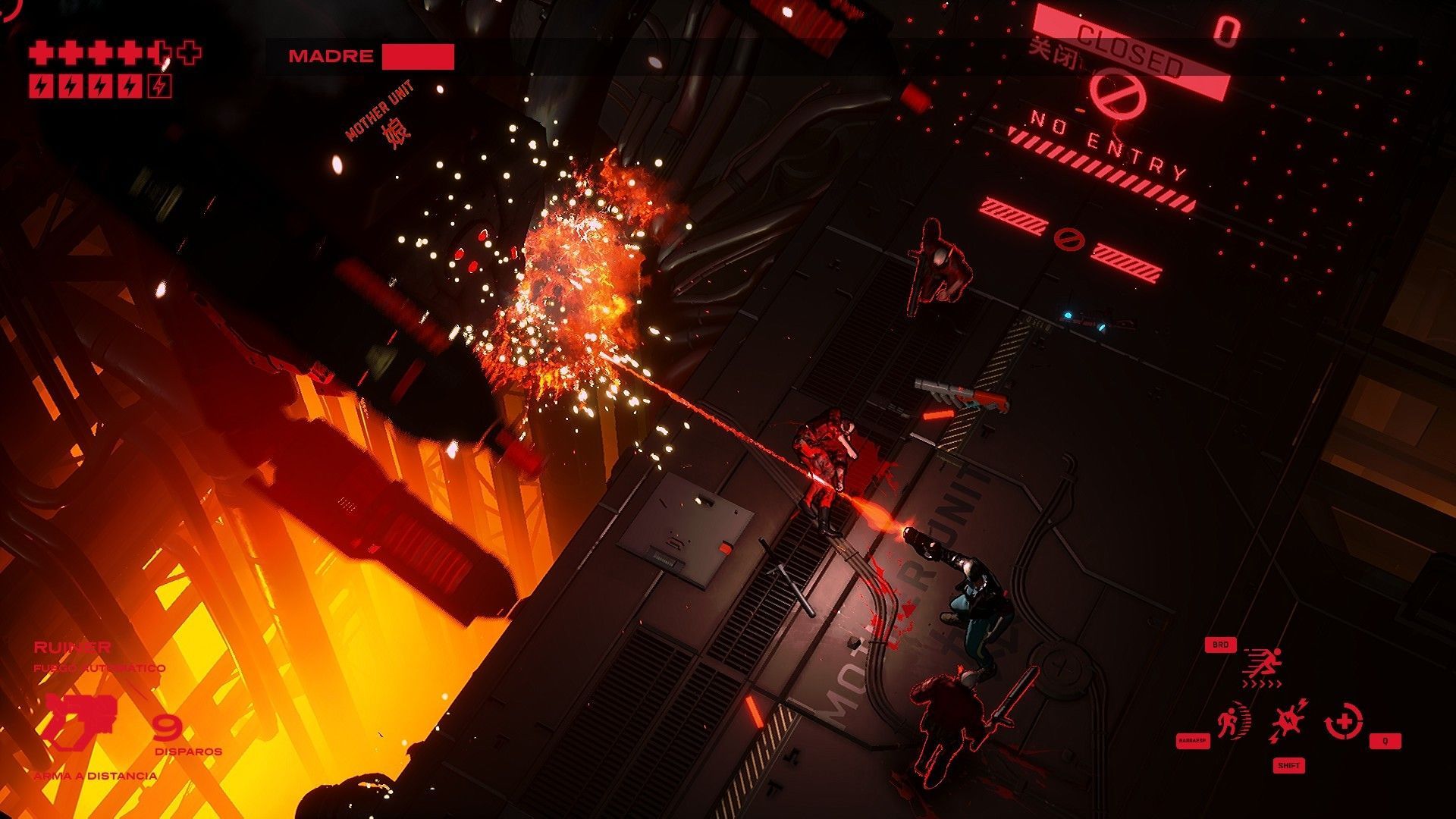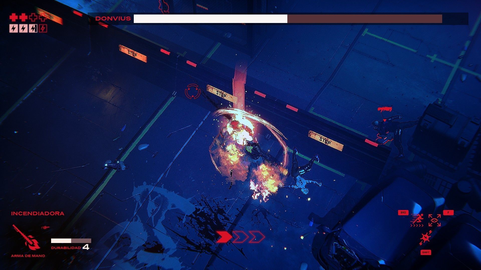 Convencidos por los detalles más técnicos de Ruiner, ¿cómo se comporta en el terreno jugable? Las normas son simples y a la par complejas. Cada una de las misiones (niveles) que se nos presentarán nos harán avanzar de manera lineal en la trama. Llegamos a un territorio, aparecen barreras y se nos invita a acabar con todos los enemigos para pasar a la siguiente zona donde, de nuevo, tendremos que enfrentarnos a otra remesa de enemigos. Cada nivel transcurre en un espacio diferente (suburbios, la factoría, etc) con una duración total que varía en función del nivel de dificultad y nuestra habilidad.