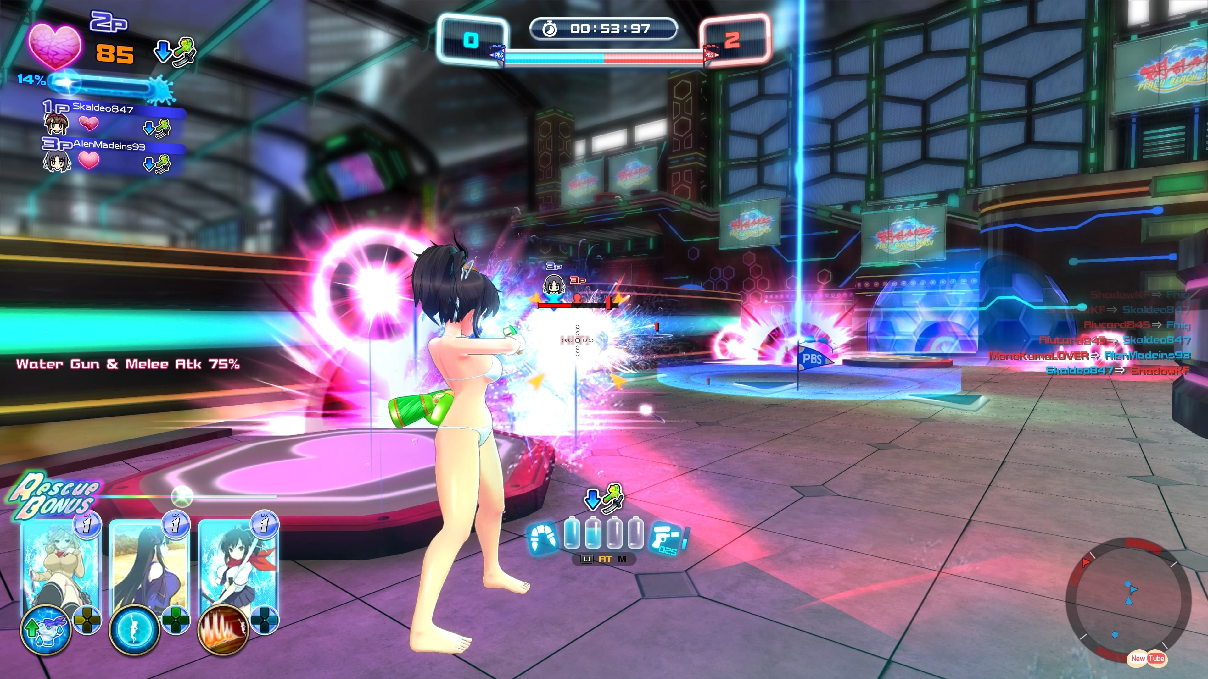 Como en todo juego por equipos, cuando un compañero cae en combate se nos da la posibilidad de acercarnos para revivirlo, aunque claro, al mismo tiempo los rivales podrán aprovechar para rematarlos con una animación especial donde se dispara un chorro de agua a alta presión para romperles y quitarles una parte del bikini, un detalle muy propio de la saga en la que estamos. Eso sí, no os penséis que vais a ver ningún desnudo, ya que pezones y zonas íntimas están apropiadamente censuradas con unos puntos de luz brillantes.