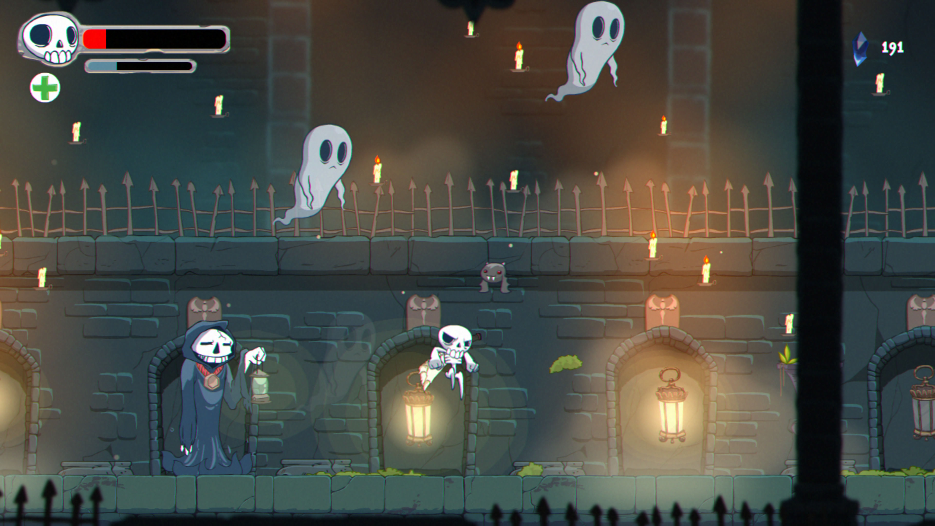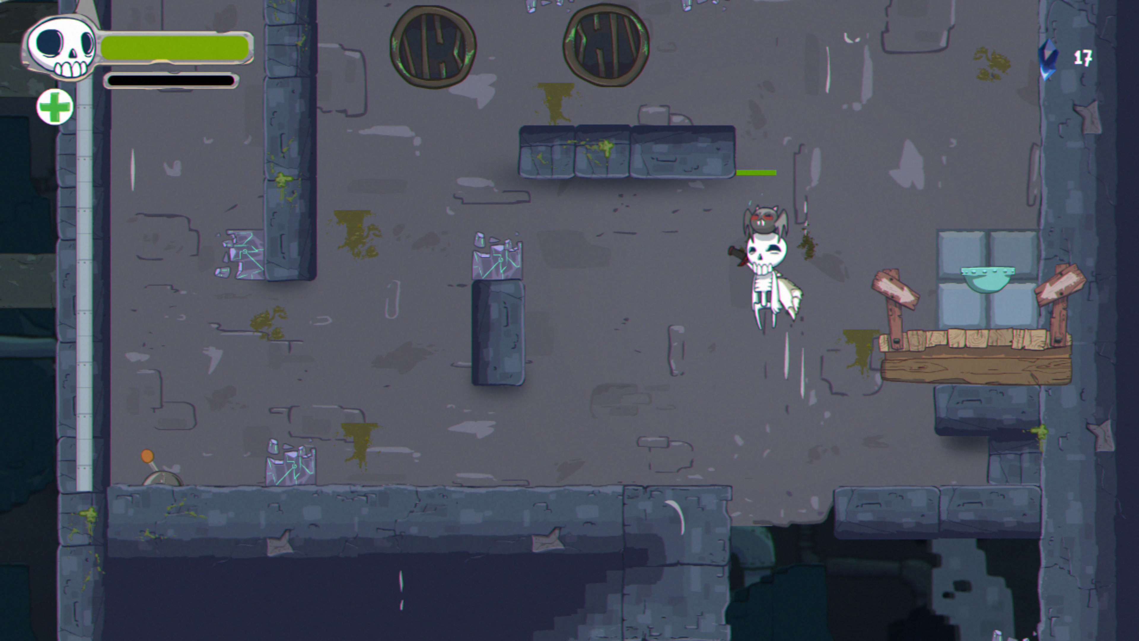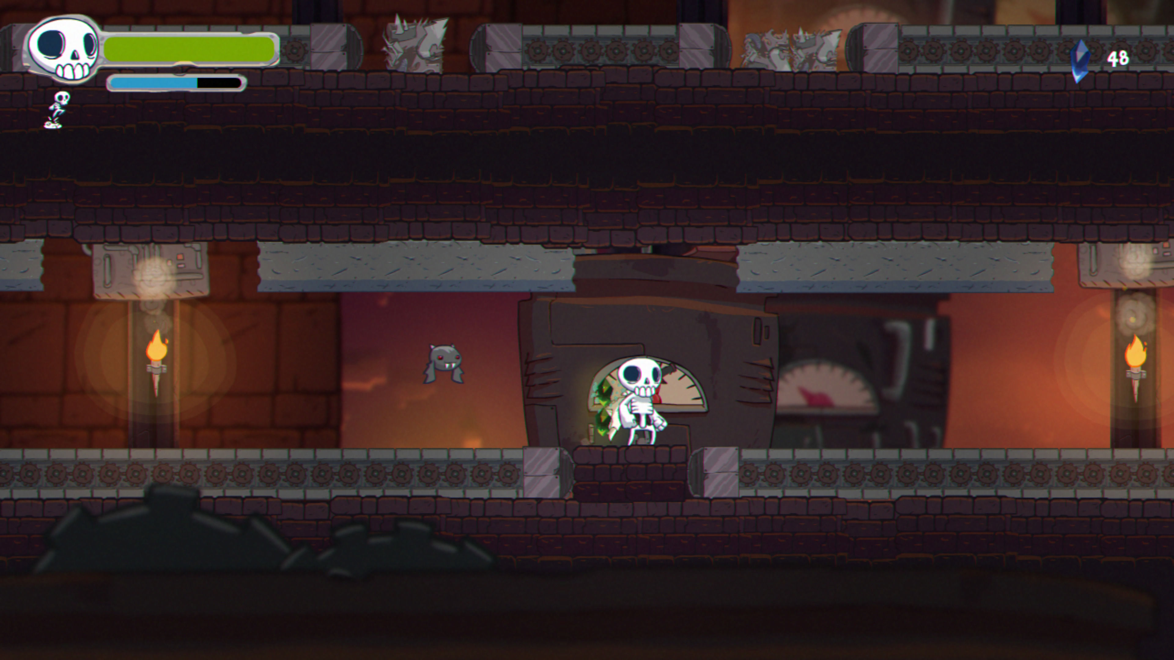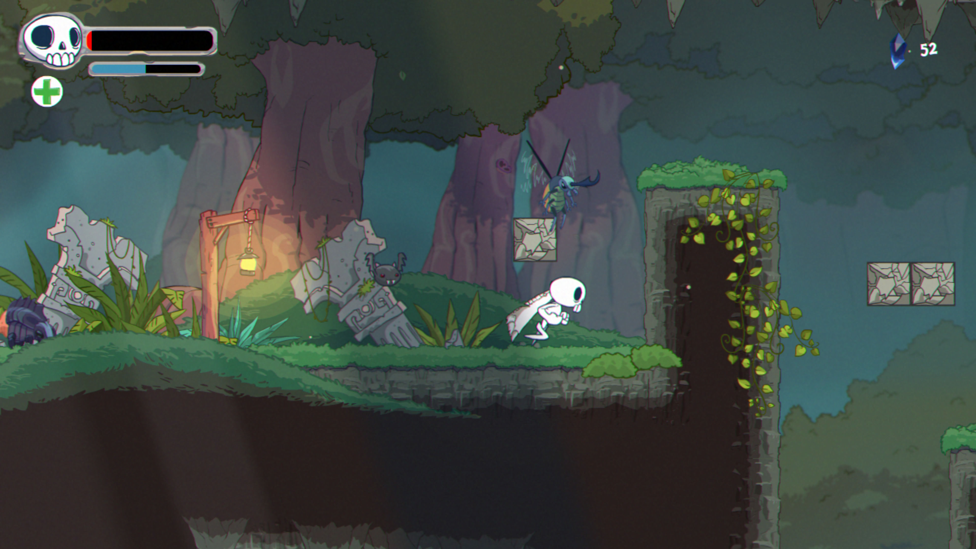 Nuestro protagonista, Skully, comienza con acciones muy básicas como saltar y golpear con una espada, y según vamos avanzando vamos desbloqueando otras como triple salto, lanzar costillas a modo de bumerán o usar un sónar para ubicar secretos. Nuestro coprotagonista, un pequeño murciélago, también tiene sus momentos para brillar, ya sea en solitario o sirviendo como propulsor para Skully. Son secuencias que le dan variedad al desarrollo, que le sientan bastante bien y, que ayudan a romper con la monotonía.