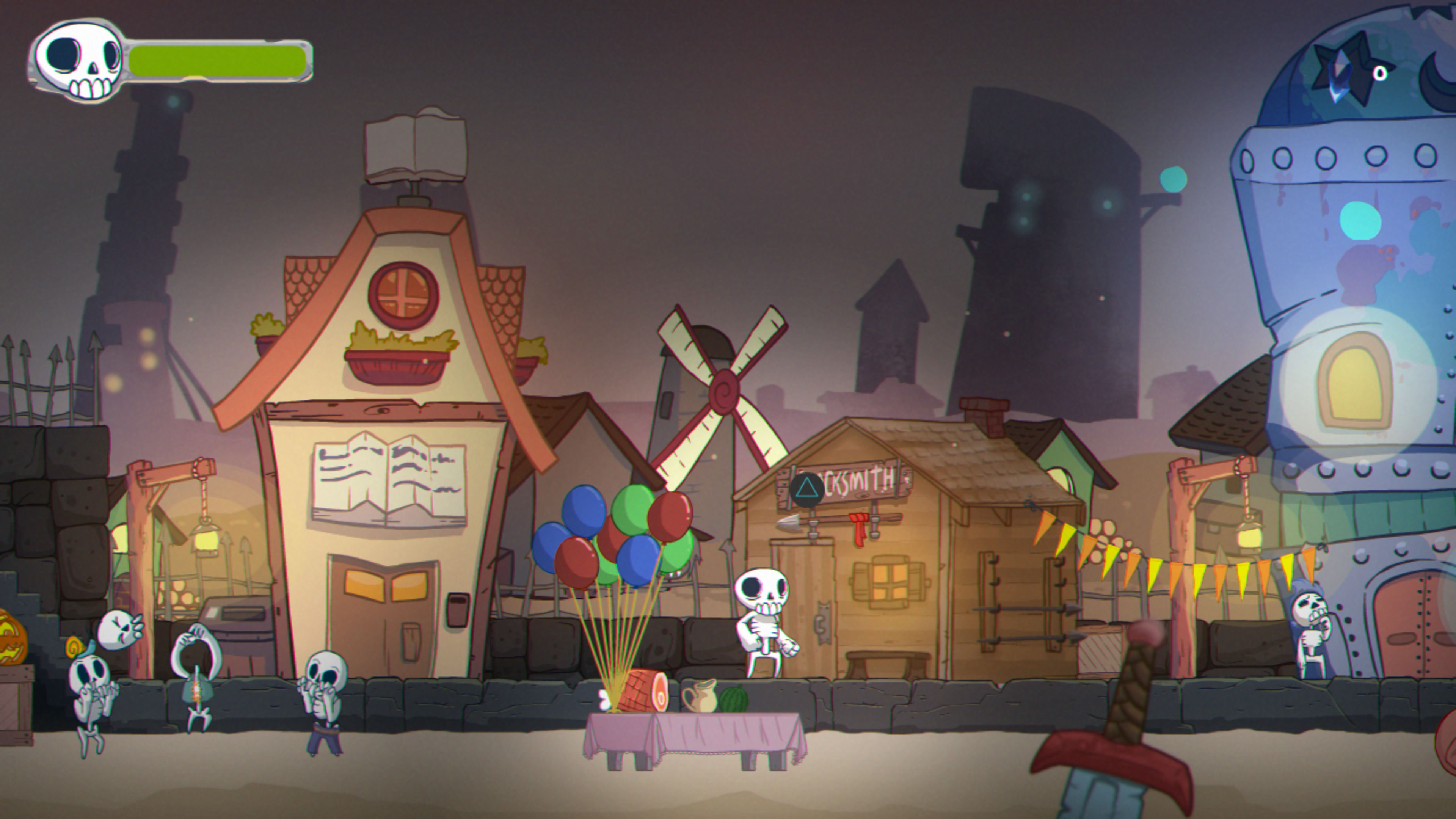 Skelattack es un juego de acción y plataformas en dos dimensiones, con cierto toque metroidvania en el diseño de niveles. Queremos dejar claro que no es un metroidvania como tal, con un mapa conectado completamente, sino que las fases nos llevan de una zona a otra, y nos obligan a encontrar objetos, hablar con ciertos personajes o conseguir habilidades para avanzar. Es como un acercamiento mucho más ligero al género, con las plataformas y la acción como principales protagonistas.