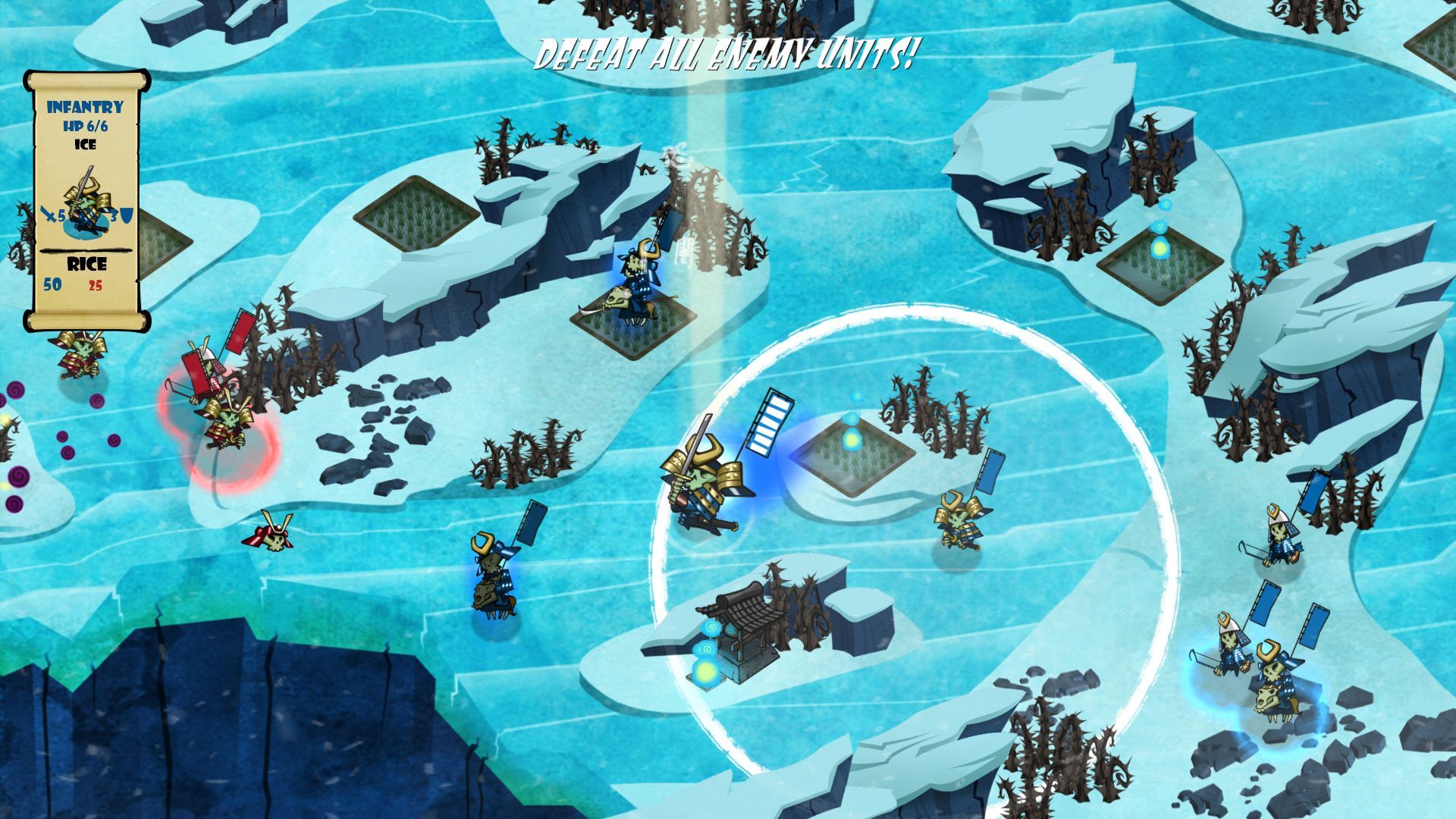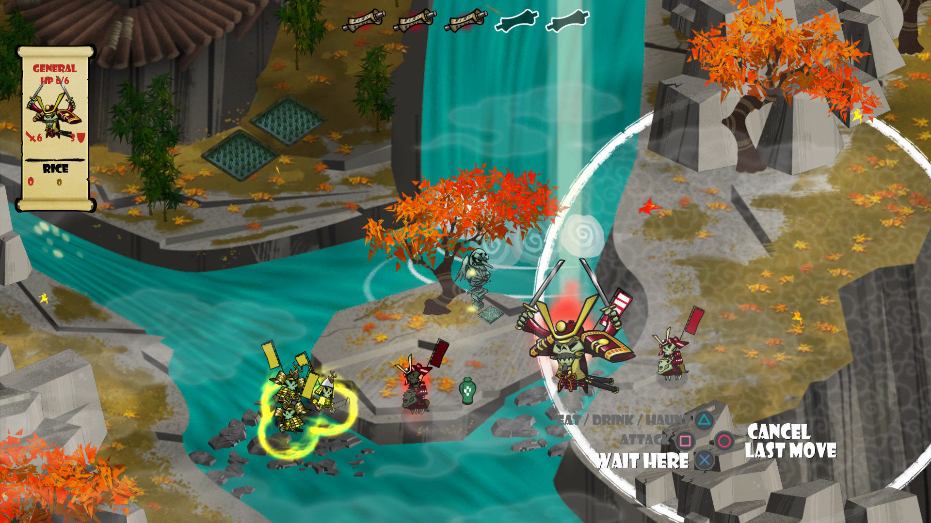 A diferencia de otros juegos de estrategia y turnos, Skulls of the Shogun prescinde de los mapas divididos en casillas estilo tablero –que es la mecánica de muchos SRPG japoneses-. El rango de movimiento se verá únicamente limitado por un círculo que veremos alrededor de nuestros personajes, el cual será mayor o menor dependiendo de la unidad que usemos.