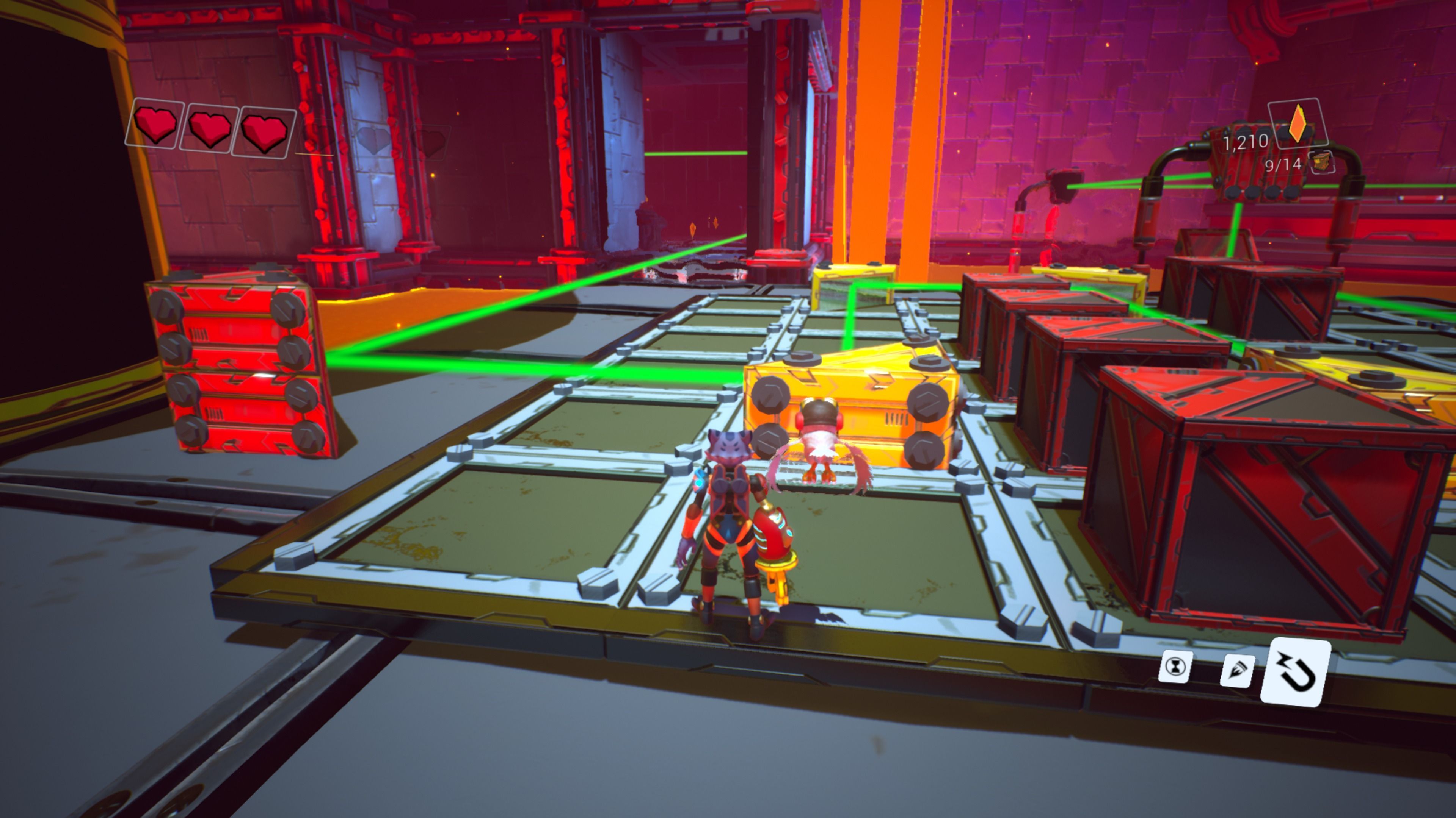 Comenzamos con unos movimientos básicos, como el doble salto y los ataques cuerpo a cuerpo, y al avanzar por la aventura conseguimos varios dispositivos nuevos en cada zona, que nos dan nuevos movimientos y habilidades. Primero un jet pack que nos permite planear y realizar un salto especialmente alto; luego un guante magnético que permite atraer y lanzar objetos metálicos, ya sean enemigos o elementos del escenario que tenemos que mover para resolver puzles; y por último un orbe mágico que nos permite ralentizar el tiempo, y que se usa en diferentes zonas de puzles y plataformeo.