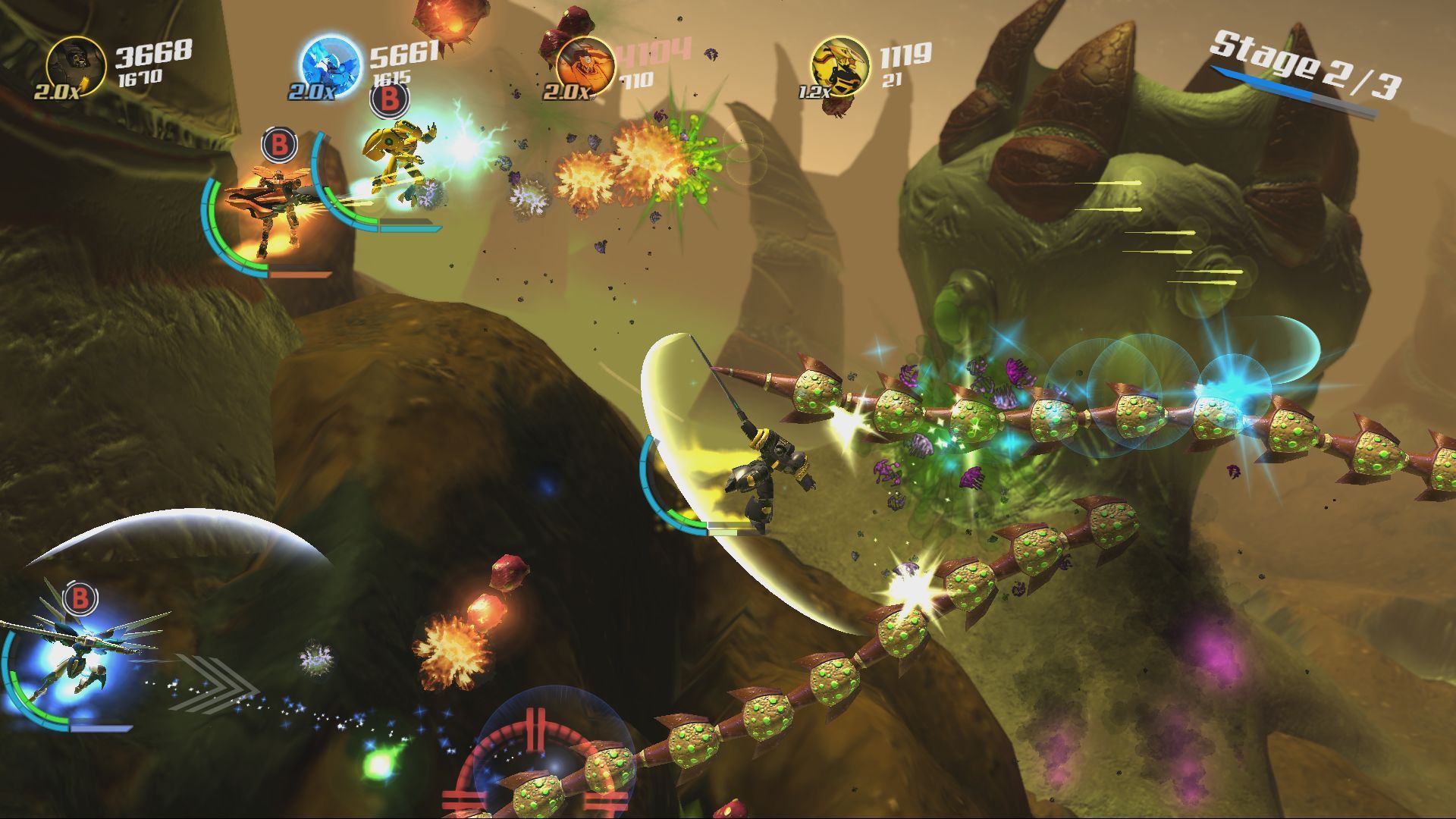 Como hemos comentado anteriormente, Stardust Galaxy Warriors es un juego eminentemente multijugador cooperativo, pero también permite ser disfrutado de manera individual. De esta manera tiene algo menos de gracia, porque lo primero que hacemos es elegir qué mecha manejamos, y hay cinco tipos de robots: a distancia, cuerpo a cuerpo, ligero, de apoyo defensivo y de apoyo ofensivo.