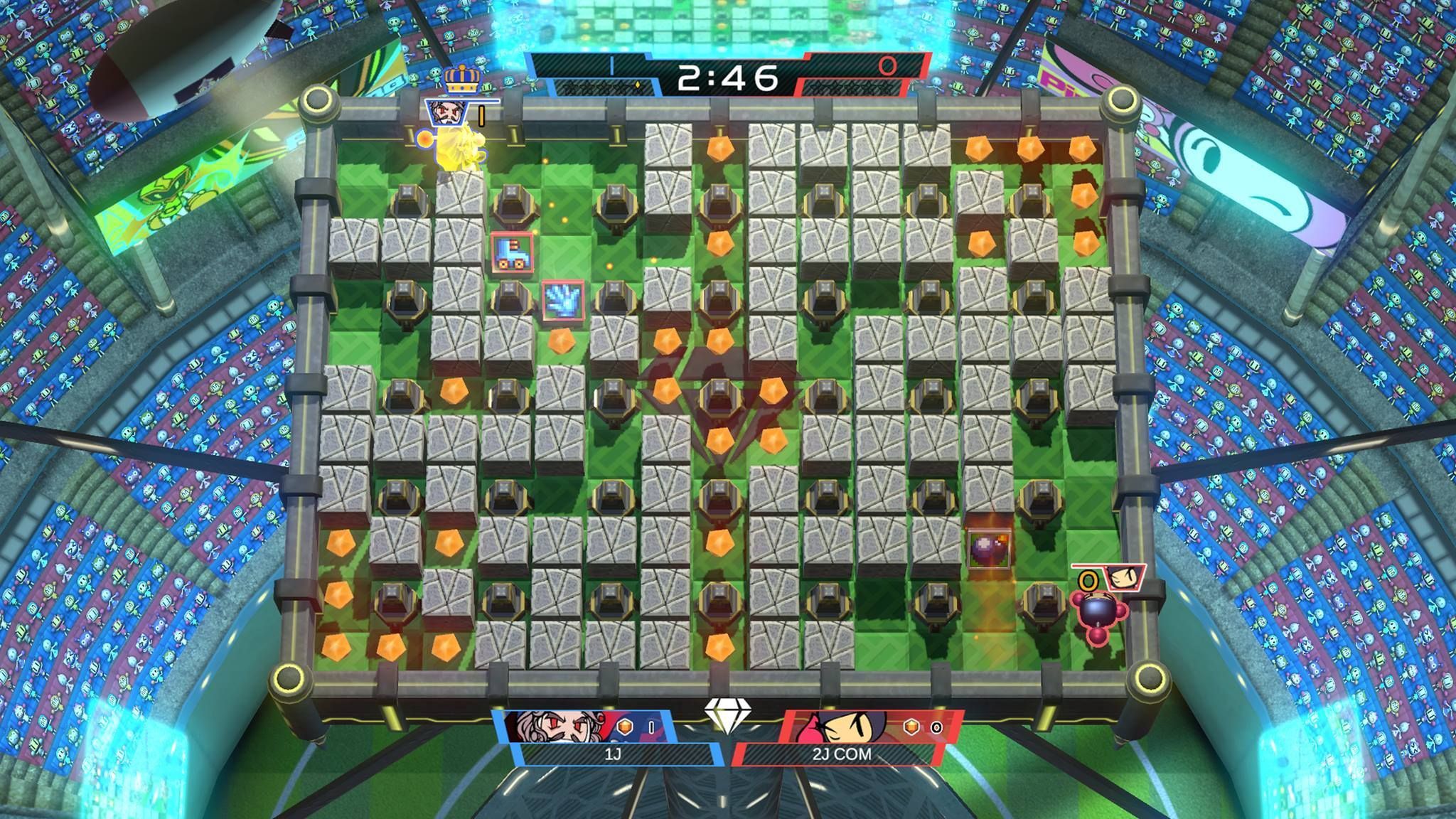En su lanzamiento para la consola de Nintendo estas eran todas las opciones, pero meses más tarde recibiría –con una actualización gratuita- Gran Premio, con partidas por equipos de tres jugadores y dos opciones: Bomber básico, que consiste en la derrota de los enemigos, y Cristal, donde lucha por conseguir unos cristales distribuidos por el mapa. Cada personaje tiene diferentes poderes y los personajes que causan baja resucitan pasado un tiempo. Este modo da más alternativas al multijugador –y al juego en solitario, puedes elegir CPU de rival- y de haber debutado con el juego en Switch sin duda habría hecho el lanzamiento más redondo.