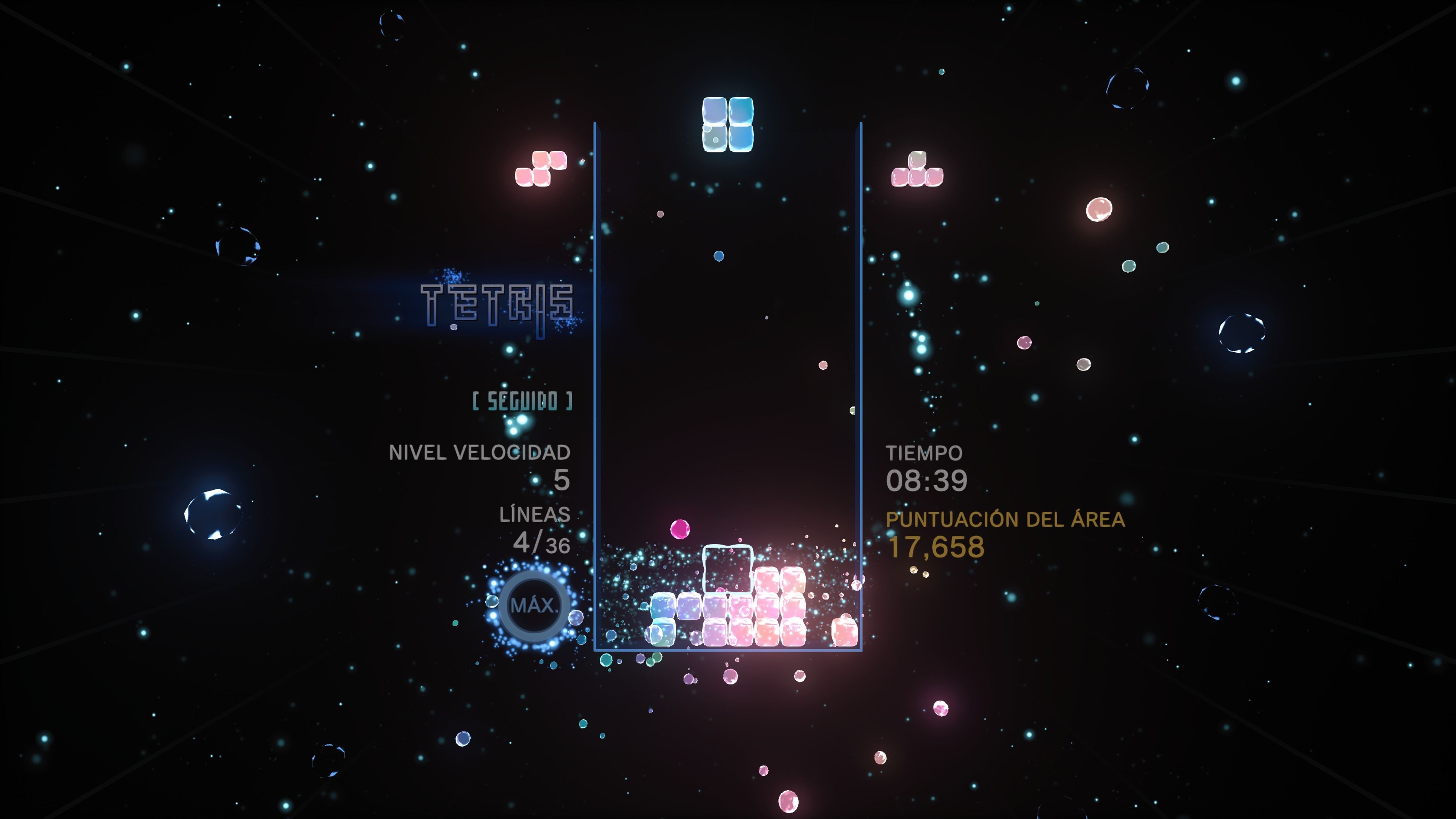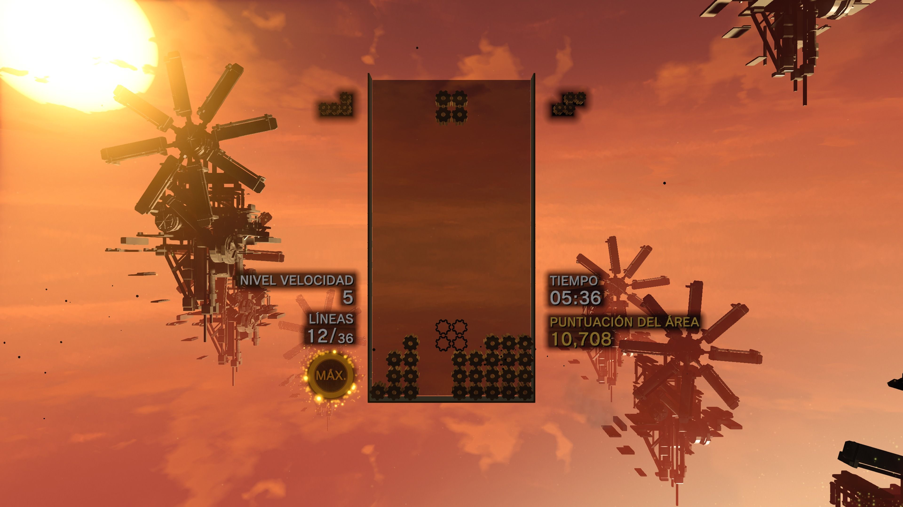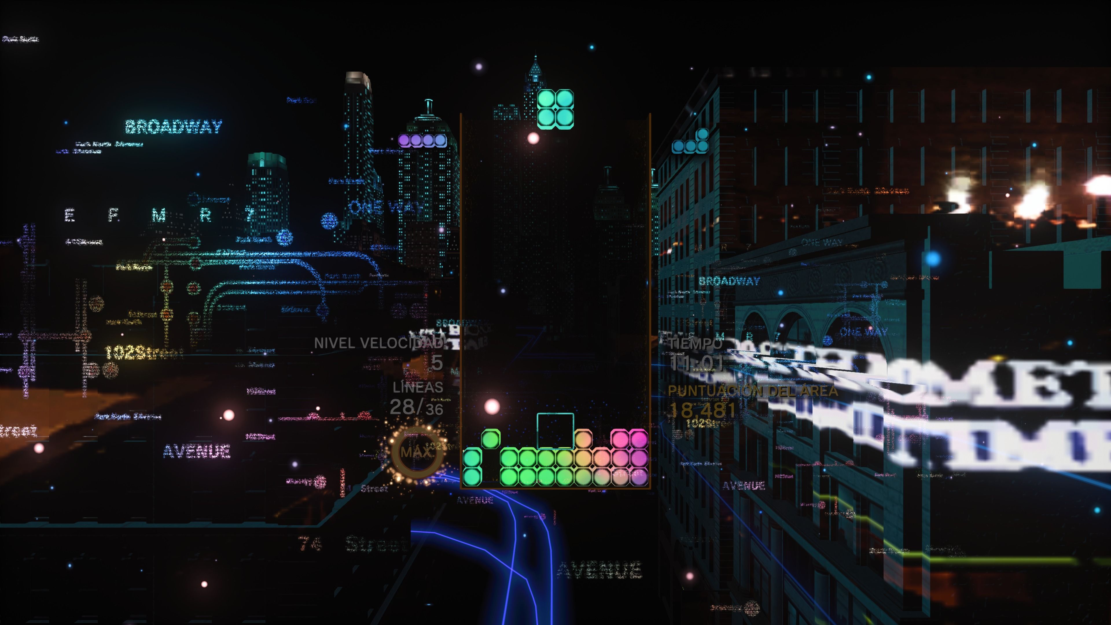 Los más de 30 escenarios le dan personalidad a cada fase, y nos van sorprendiendo según progresamos. Van cambiando al ritmo de la música, que casi componemos nosotros. Las melodías se enlazan con los giros de nuestras piezas y los efectos se sincronizan con nuestras líneas. Son pequeños detalles que te envuelven y, en cierto modo, reinventan la experiencia Tetris.