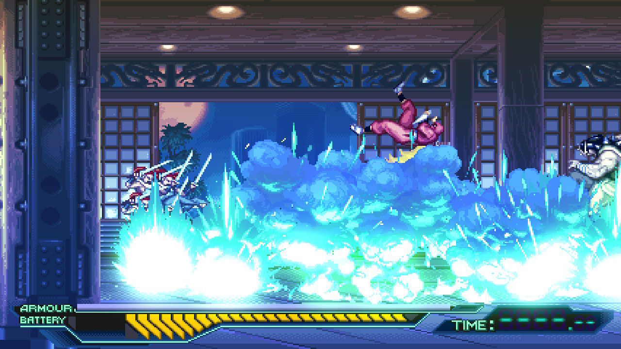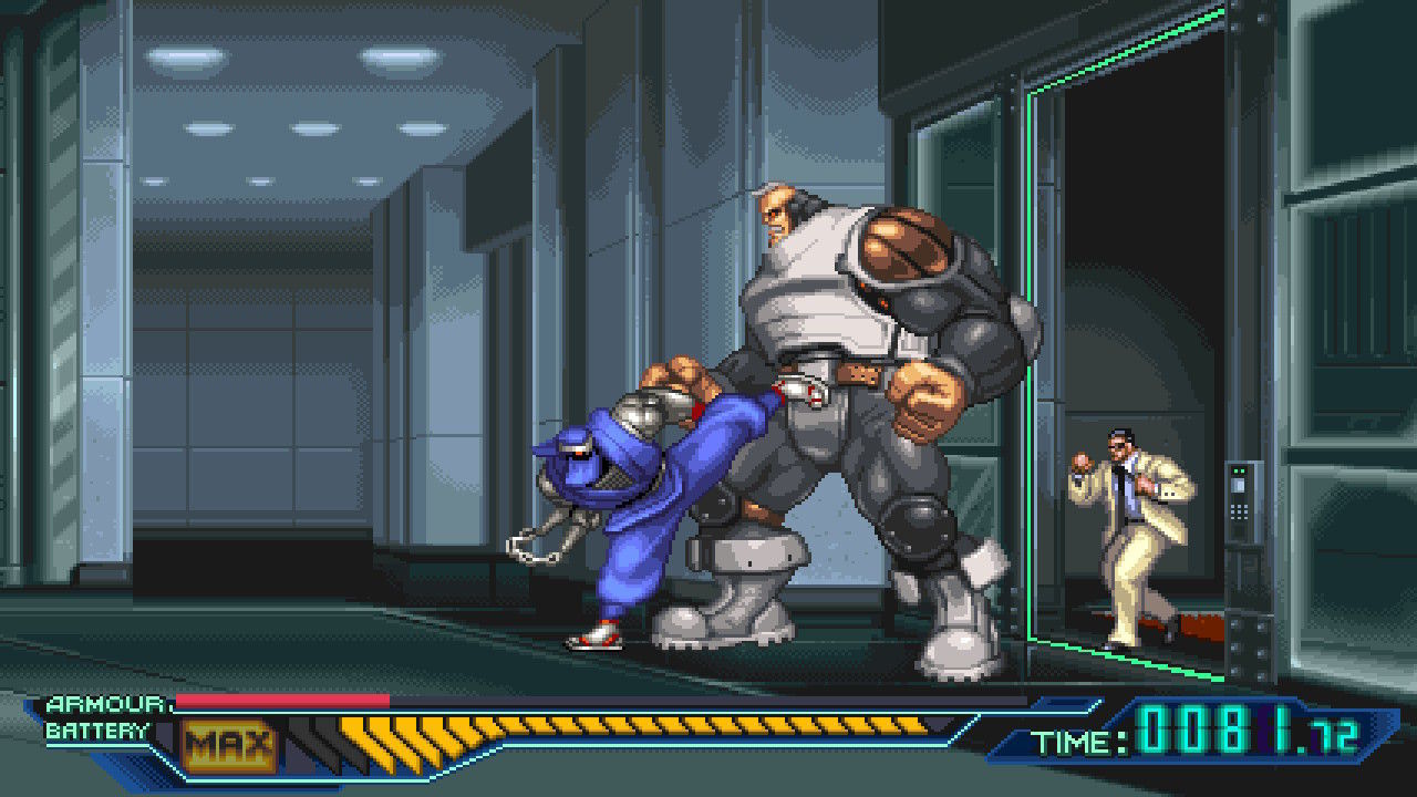 El pan y la sal de este título estriba en su planteamiento jugable, el cual es muy simple y directo. A lo largo de ocho niveles no especialmente extensos que suelen dividirse en varias zonas distintas tenemos que liquidar, una tras otra, a las interminables hordas de adversarios que van apareciendo en imagen. Y la forma de hacerlo es a través de todo tipo de técnicas y ataques ninja que os podáis imaginar, dado que los protagonistas son precisamente eso mismo: unos ninjas… robóticos, eso sí. Una característica muy especial que les convierte en auténticas máquinas de liquidar enemigos.