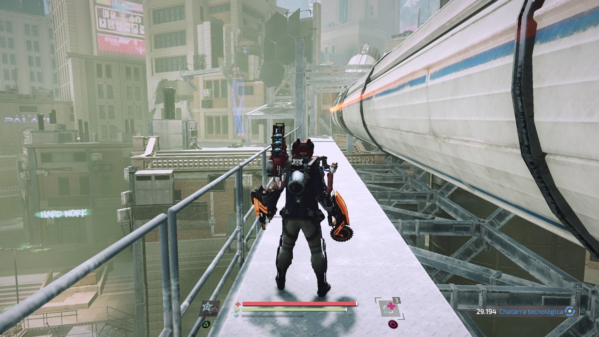 Jericho tiene personalidad. Pasamos por sus calles caóticas llenas de enemigos y de andamios, de avisos de advertencia de las autoridades que tratan de contener el caos y a medio construir; viajamos por sus diferentes distritos, cada uno con un estilo propio, unos habitantes que forman tribus urbanas como los yonkis de una droga futurista, los cazadores o los adeptos al culto religioso del momento; y conocemos las historias de sus personajes a través de conversaciones con NPC, archivos de audio e imágenes del pasado proyectadas. El trabajo de creación de universo en The Surge 2 está un peldaño por encima de la primera parte.