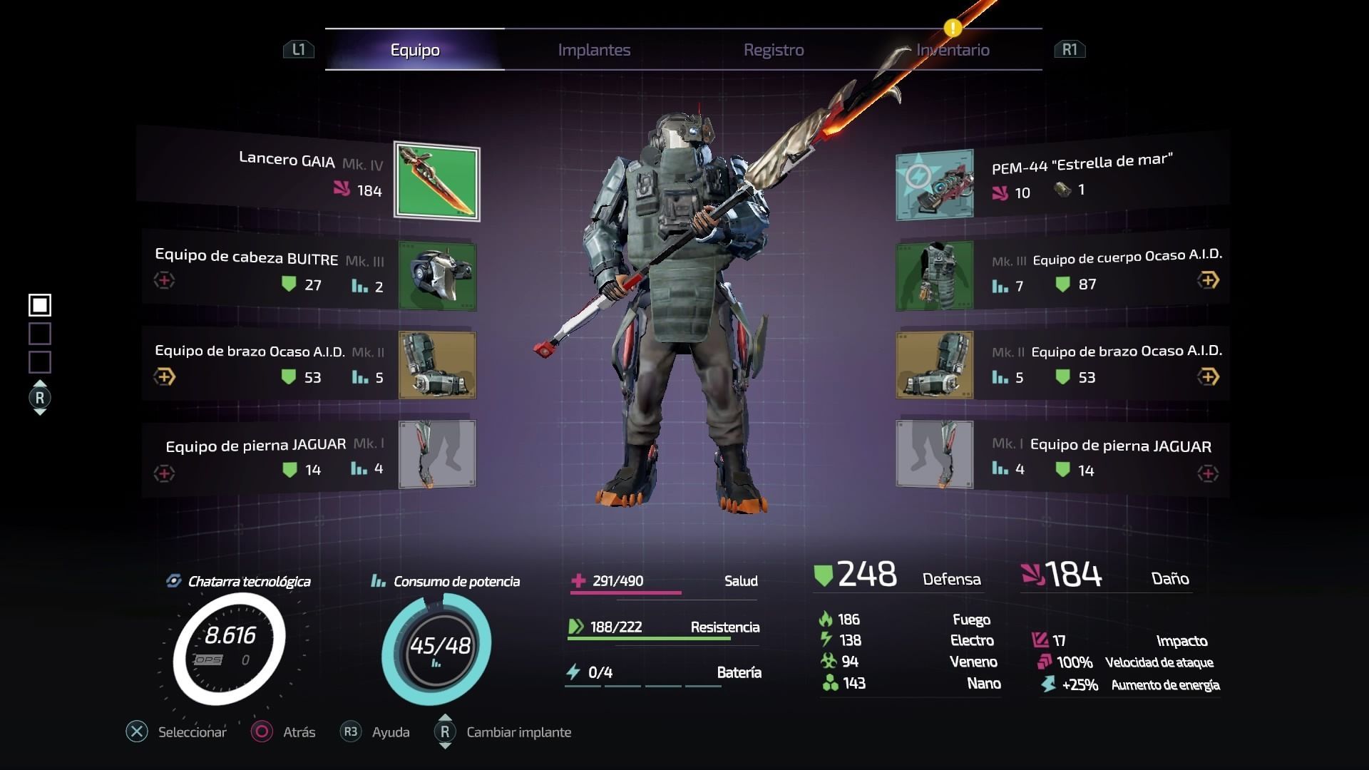 La versatilidad del protagonista vendrá dada por los implantes que usamos, que dependen del consumo máximo de energía que tengamos —cada implante consume puntos como en el original—, por la armadura que portemos y por el tipo de arma que usemos. En la faceta armamentística también ha crecido la selección: desde garras a dos manos hasta lanzas, mazas, etc. Tenemos opciones suficientes para adaptar nuestro estilo de juego al que más nos atraiga: velocidad, ataques cercanos, a distancia media, etc. Y no nos olvidemos del dron, que adquiere más importancia y utilidad en esta segunda parte.