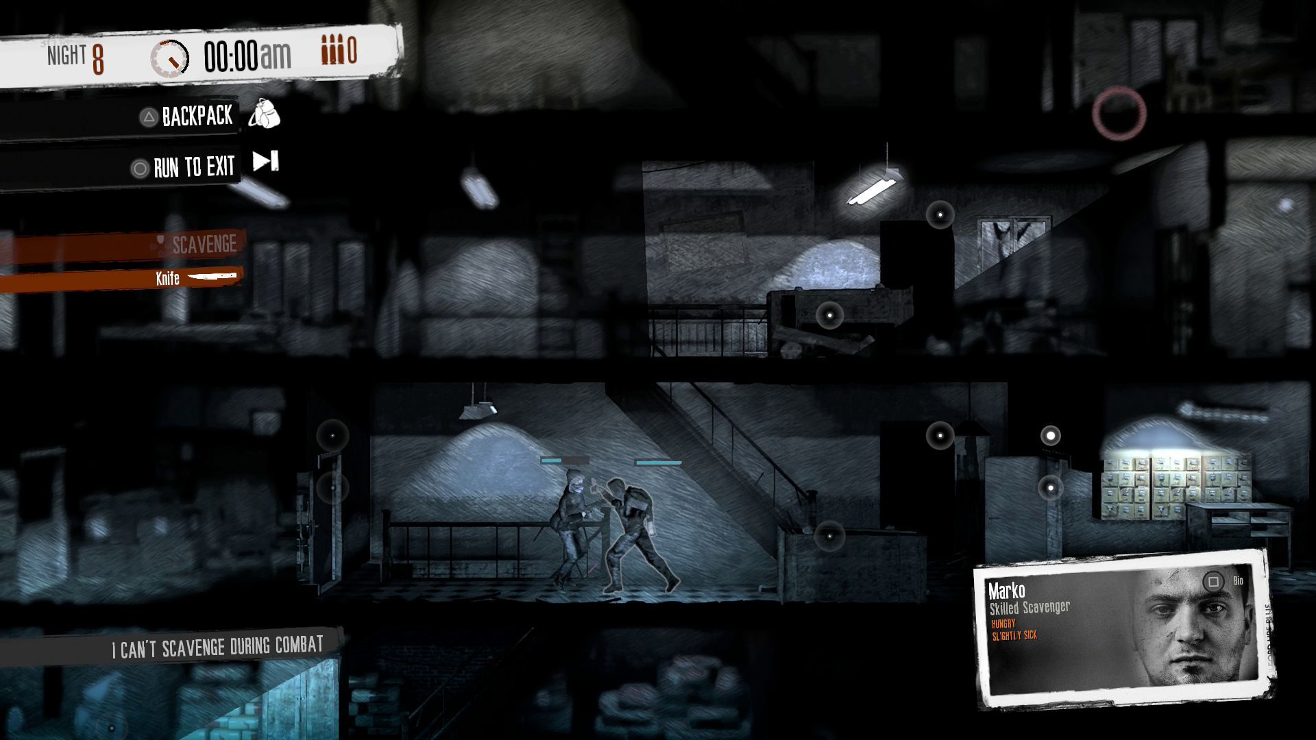 En este sentido, el título se comporta como un juego de género, permitiéndonos la recogida objetos y materiales básicos en diferentes lugares de una ciudad que, poco a poco, irá abriéndose a nosotros. Encontraremos fácil la elección de un adulto a la hora de buscar o explorar nuevas localizaciones -principalmente, porque tenga una buena condición física o una mochila mayor para cargar objetos-, pero más complicado será lo de elegir un sitio para nuestras incursiones. En el título siempre tendremos a nuestra disposición un montón de emplazamientos derruidos en los que encontrar comida y objetos variados, y en los que This War of Mine se revela como algo más que un simple videojuego de ambientación bélica.