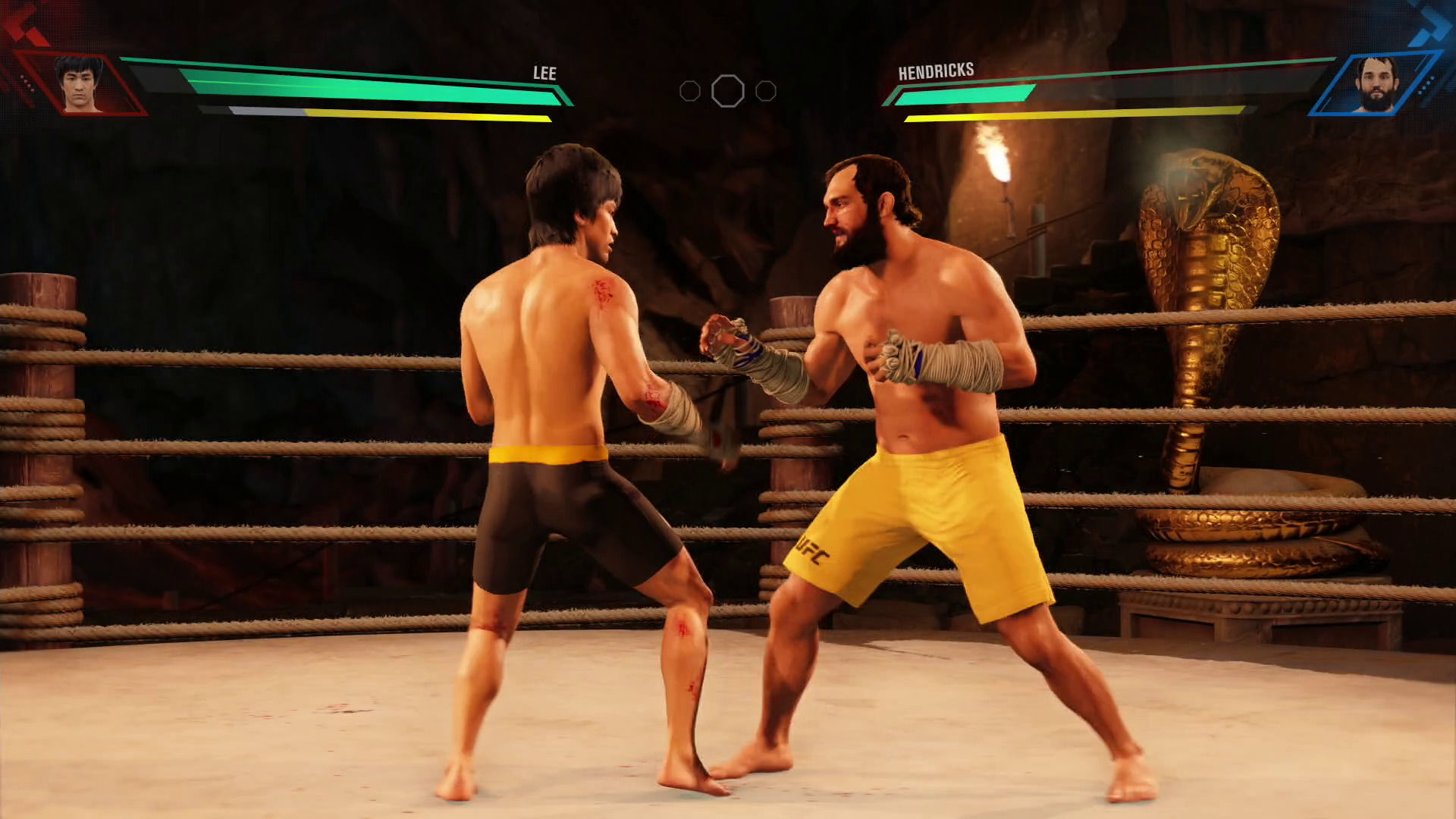 Por lo tanto, olvidaos de encadenar combos de 12 o 14 golpes como se hace en títulos de corte arcade ya que aquí el número de golpes consecutivos será de 3 o 4 en el mejor de los casos, siendo, de hecho, muy desaconsejable aporrear los botones "a lo loco" para no parar de propinar golpes, ya que nuestro luchador se quedará sin resistencia enseguida y estaremos a merced de nuestro rival dentro del octágono.