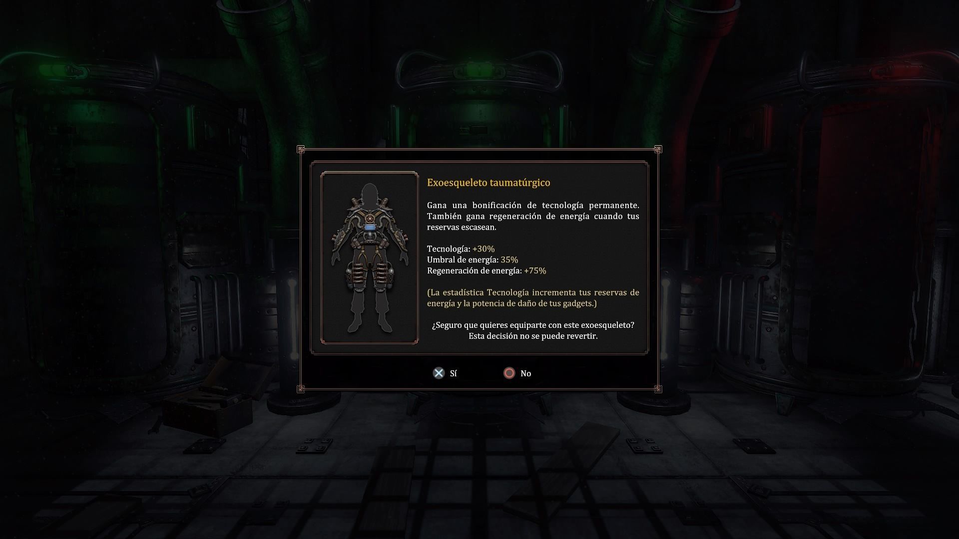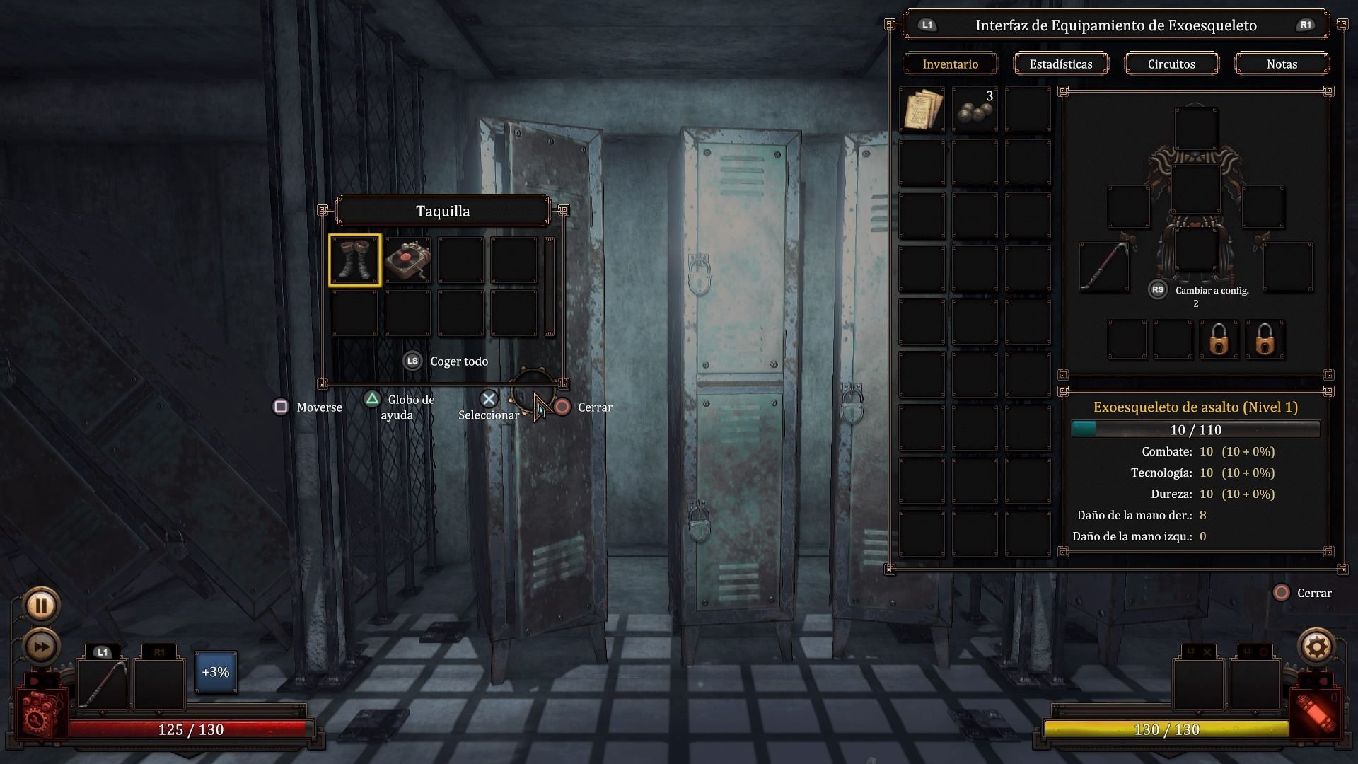 La progresión en Vaporum es bastante clásica, todo una traslación directa de los juegos de rol más clásicos, con estadísticas, probabilidades de acierto y error, bonificaciones y similares. Iremos acumulando fumium, la experiencia, tendremos dispositivos que servirán de hechizos mágicos y nos implantaremos circuitos que vendrán a ser las habilidades. No encontraremos clases diferenciadas, y todo se basará en el tipo de juego que desarrollemos en la partida y en la especialización de nuestra armadura o exotraje. De esta forma, encontraremos cuatro variantes, cada una enmarcada dentro del tipo de combate que empleemos y con sus propios pros y contras. Hay muchos poderes destructivos, combate cuerpo a cuerpo y numerosos utensilios alimentados con tecnología steampunk que servirán las veces, en su mayoría, para golpear a distancia. Dominar este tipo de ataques se convierte con el paso del tiempo en una obligación, ya que nos permitirá adelantarnos a los envites del enemigo y dañarlo con antelación, dejándolo a nuestros golpes de melee o más cercanos y destructores una vez nos aproximemos a su casilla.