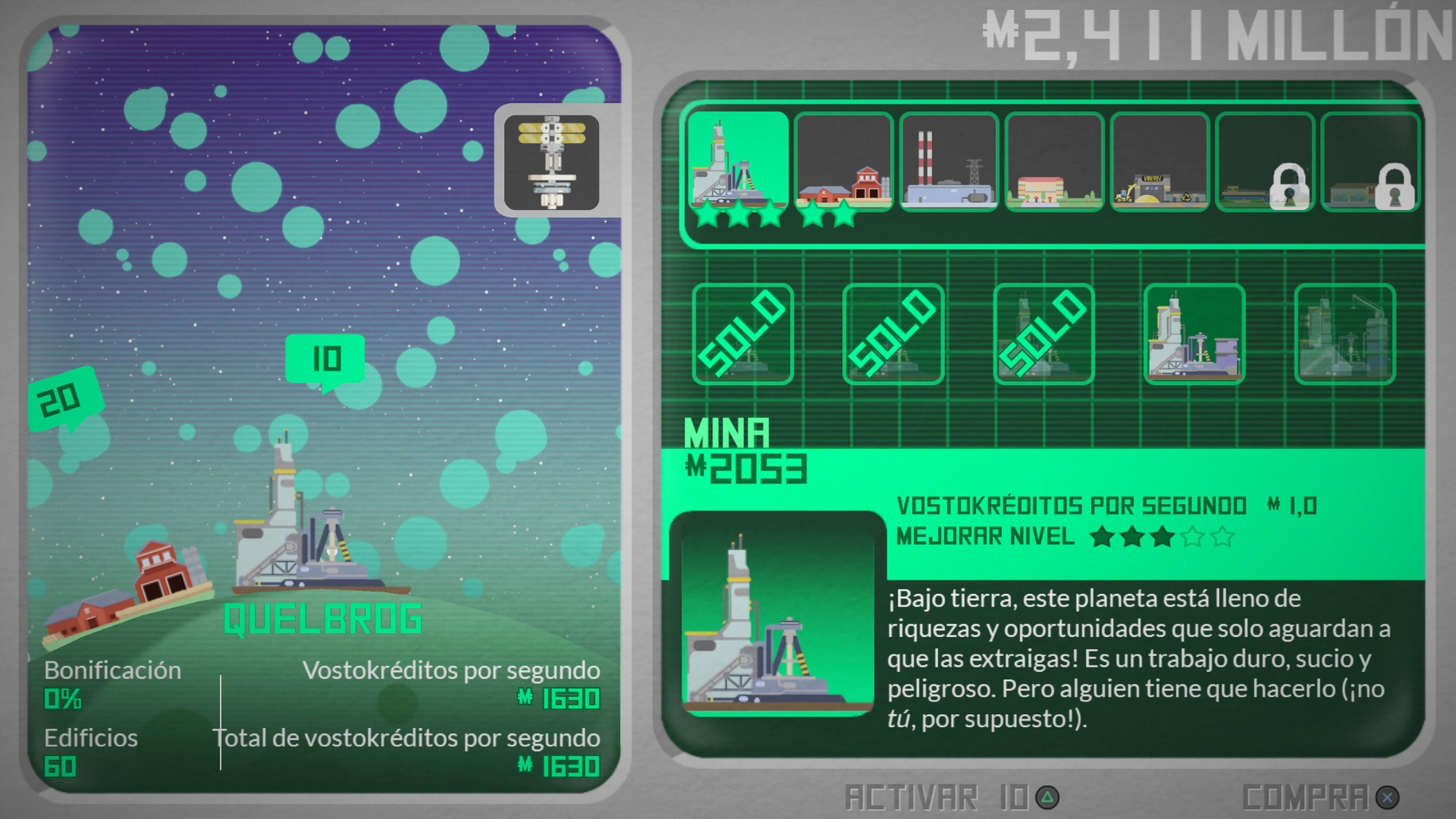 Pero por algún extraño motivo, ver nuestro contador de dinero subir hasta cifras absurdas (acabaremos acumulando hasta trillones de créditos) acaba enganchando inexplicablemente hasta el punto de que cuando nos hemos querido dar cuenta, nos encontramos jugando simplemente por la parte de gestión y estrategia que tiene el título (que no es mucha, pero todo sea por multiplicar nuestras ganancias), por lo que si buscáis un buen juego de acción, ya os vamos ahorrando seguir leyendo, porque no es lo que vais a obtener aquí.