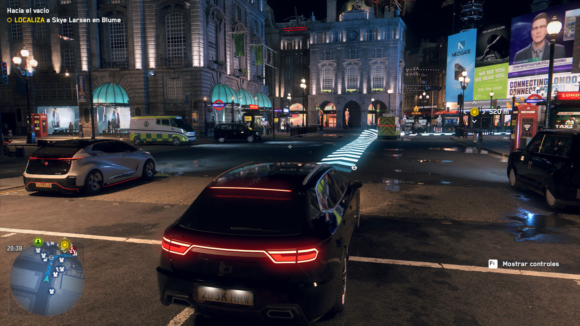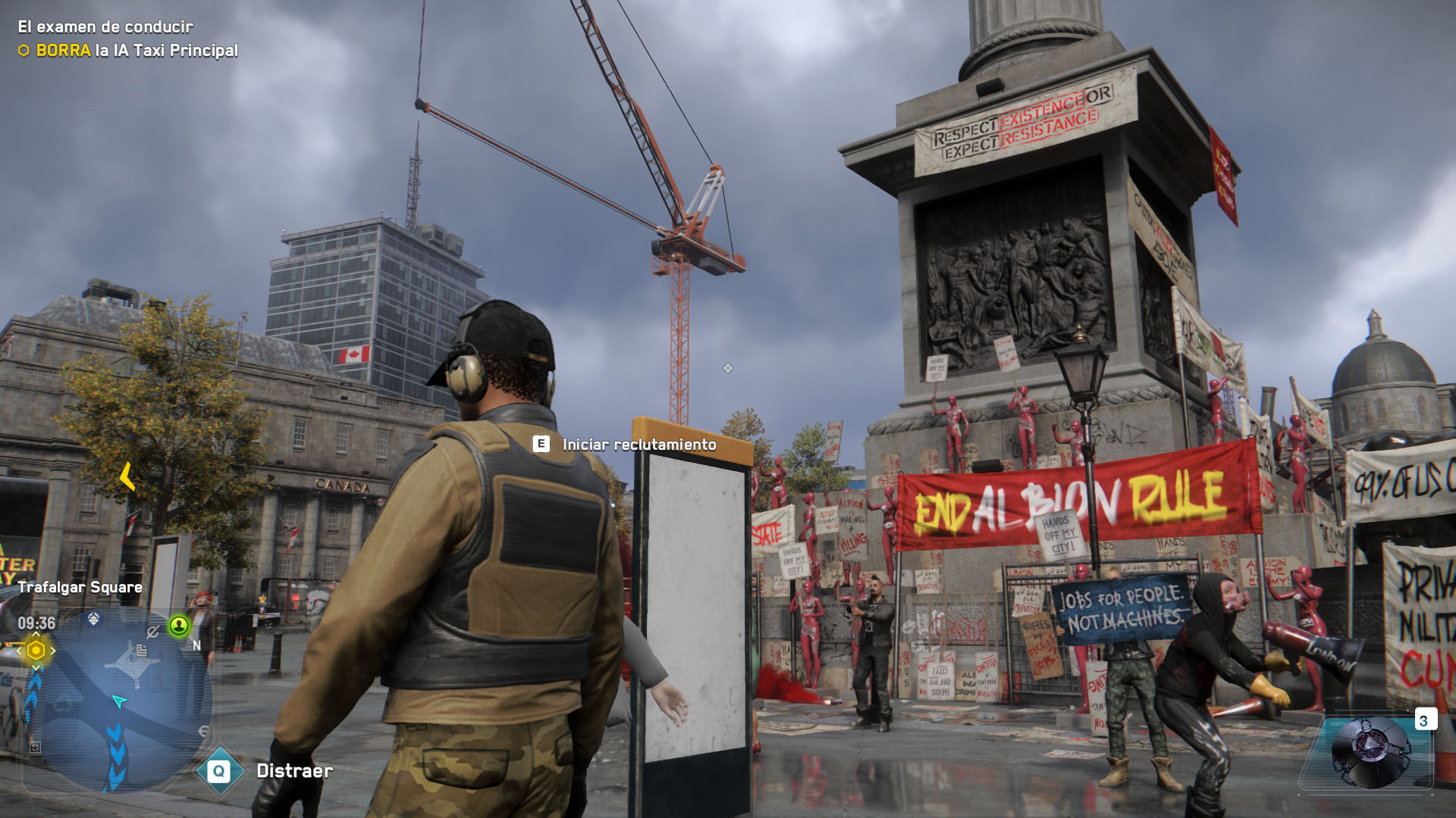 Estamos ante una Londres repleta de coches autónomos, de drones armados que vigilan y difunden propaganda, de plazas con enormes pantallas donde la televisión gubernamental muestra sin cesar sus mentiras, de calles apenas alumbradas por los neones donde los mendigos intentan sobrevivir, de controles policiales en cada esquina con militares que no dudan en dar palizas y vejar a quien les miren mal, de protestas continuas apaciguadas con violencia, de refugios de inmigrantes perseguidos por el simple hecho de ser de otro país donde cada día desaparecen uno, dos, o tres… El discurso interesante de Watch Dogs Legion no está en su guión, sino en las situaciones que vemos en la ciudad y en la propia jugabilidad.