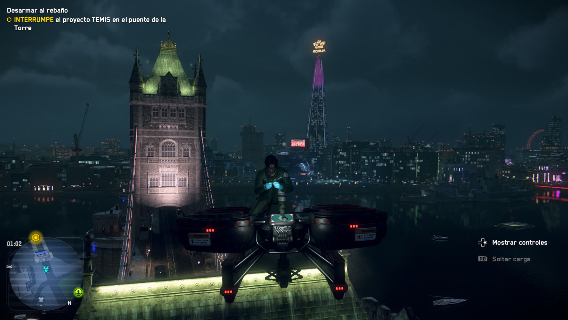 El otro motivo por el que no hemos podido parar de jugar hasta acabarlo es Londres. El trabajo que ha hecho Ubisoft Toronto tanto a nivel artístico como gráfico es espectacular. La ciudad se muestra viva, ya sea a pie de tierra con todos esos coches autónomos, peatones y militares haciendo redadas y deteniendo a viandantes; o en el cielo, con drones sobrevolando las calles. El diseño de los personajes es variado y en ciertos casos cargado de personalidad, hay suficiente distinción de vehículos como para que no haya monotonía, y hay zonas de la ciudad que nos dejan boquiabiertos por sus pantallas, su iluminación y su atención al detalle. La inmersión se rompe, eso sí, con bugs no muy frecuentes, pero sí numerosos: enemigos que se quedan bloqueados andando contra una pared, peatones que se tiran a las bocas de metro, vasos de café que flotan porque la persona que los sujeta no ha cargado y NPCs que sueltan la misma línea de diálogo en bucle, entre otros problemas que nos hemos encontrado.