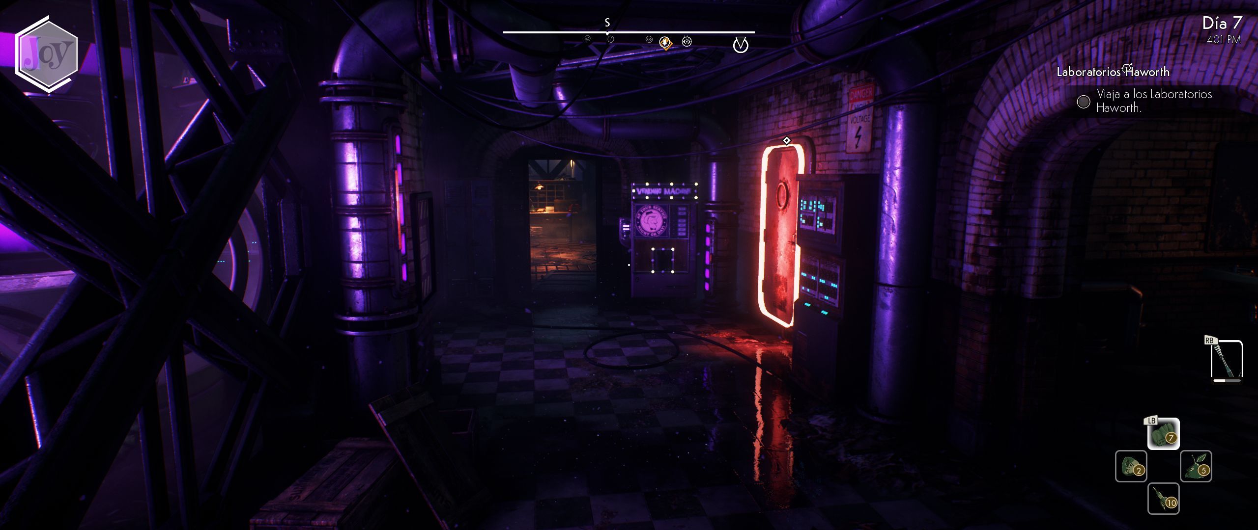 Como decíamos, We Happy Few comenzó como un juego de supervivencia de esos que tanto se estilaban hace unos años, pero el equipo lo convirtió en un juego más guiado y con historia tras escuchar las peticiones de los fans. La historia les ha quedado genial y está muy bien contada, pero la base sobre la que la construyeron es la de un juego de supervivencia en mundo abierto, y esto se traduce en mecánicas que ya no tienen mucho sentido, paseos interminables de una zona a otra para recoger objetos o saquear con un personaje que apenas puede correr cinco segundos sin asfixiarse.