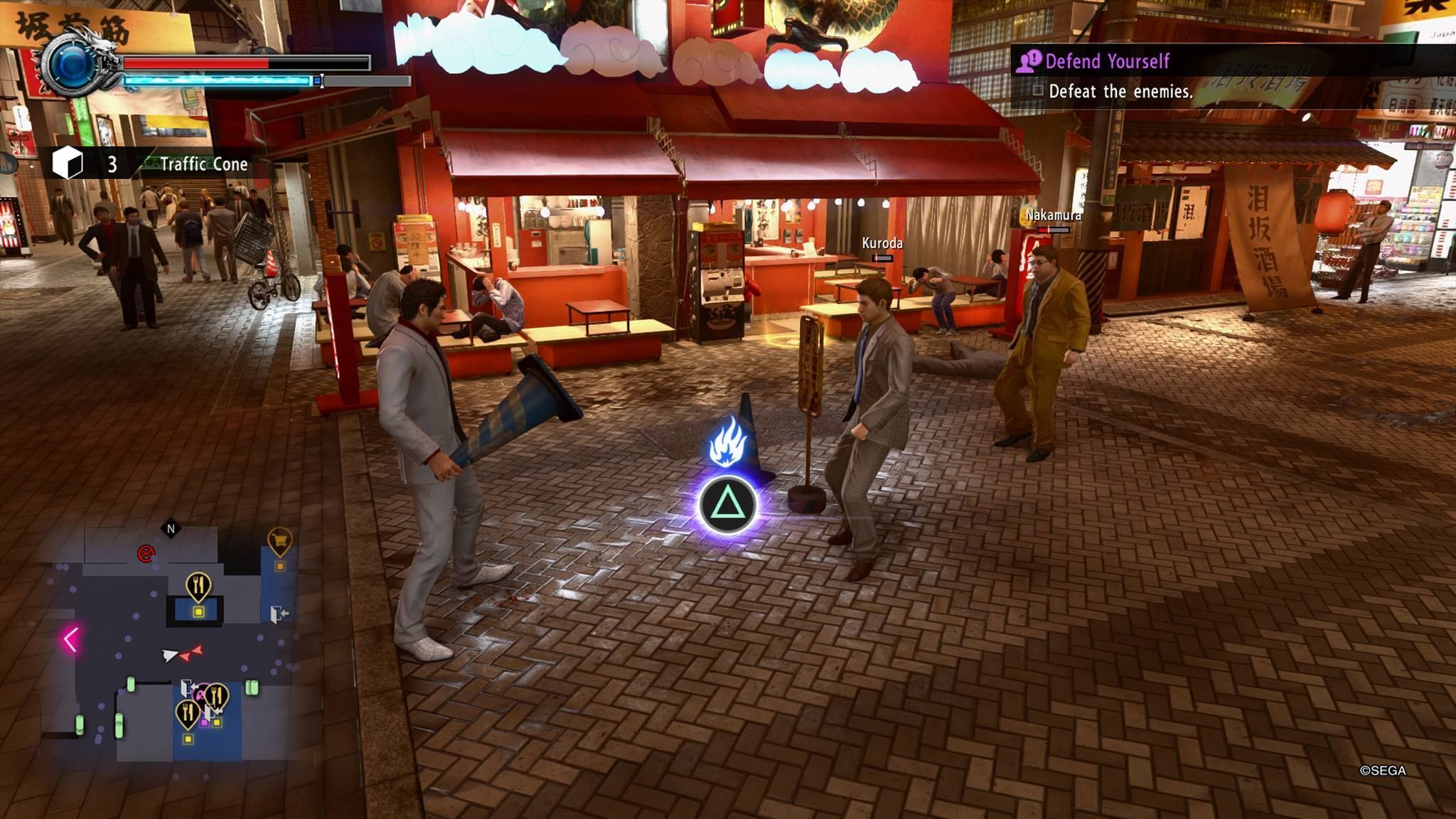 A lo largo de nuestra aventura nos iremos encontrando con matones o yakuzas. Serán despachados con el sistema habitual en Yakuza: golpes básicos, agarres y uso de objetos del escenario como armas improvisadas. Eso sí, esta vez la base es la de Yakuza 6 y no la del original, así que todas las animaciones y mecánicas de ese juego están presentes, e incluso se amplía con el regreso de la opción de guardar en nuestro bolsillo varias armas como cuchillos o palos, que siempre dan un daño extra útil contra jefes y oponentes fuertes.