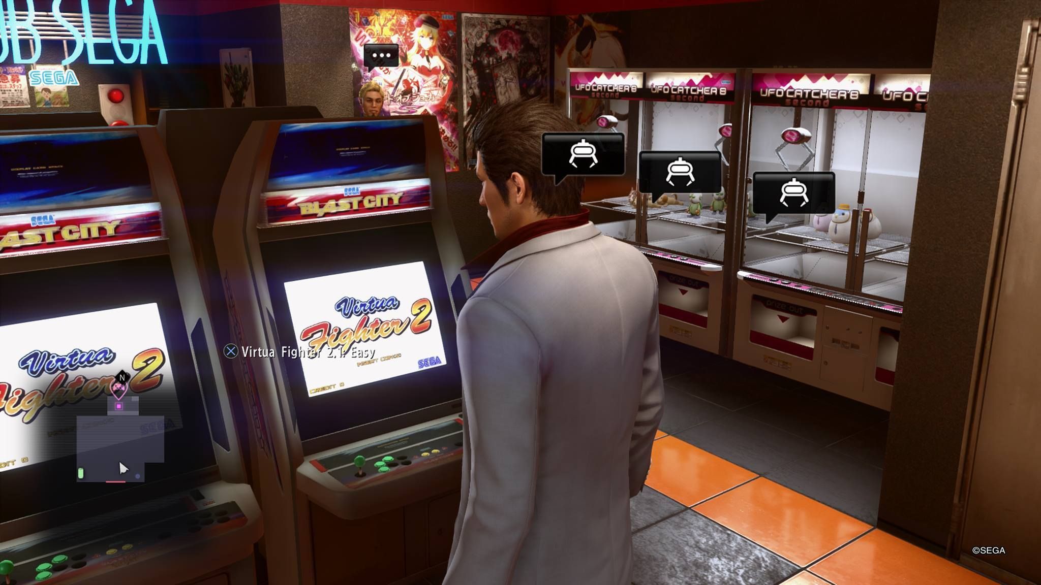 En cuanto a recreativas tenemos Virtua Fighter 2, la divertida –y revolucionaria- máquina de lucha que se puede jugar tanto dentro del juego, en modo arcade, como para dos jugadores desde el menú principal. Los seguidores de Yakuza recordarán que apareció en Yakuza 5, por tanto no es un regalo tan sorprendente como el Virtua Fighter 5 Final Showdown de Yakuza 6, pero es una buena opción para jugar de nuevo al título en PS4. Más novedoso es Virtual-On, un juego de luchas con robots que tuvo cierta fama en los 90, pero nos ha parecido que envejeció bastante mal en lo jugable. Al menos merece un vistazo.