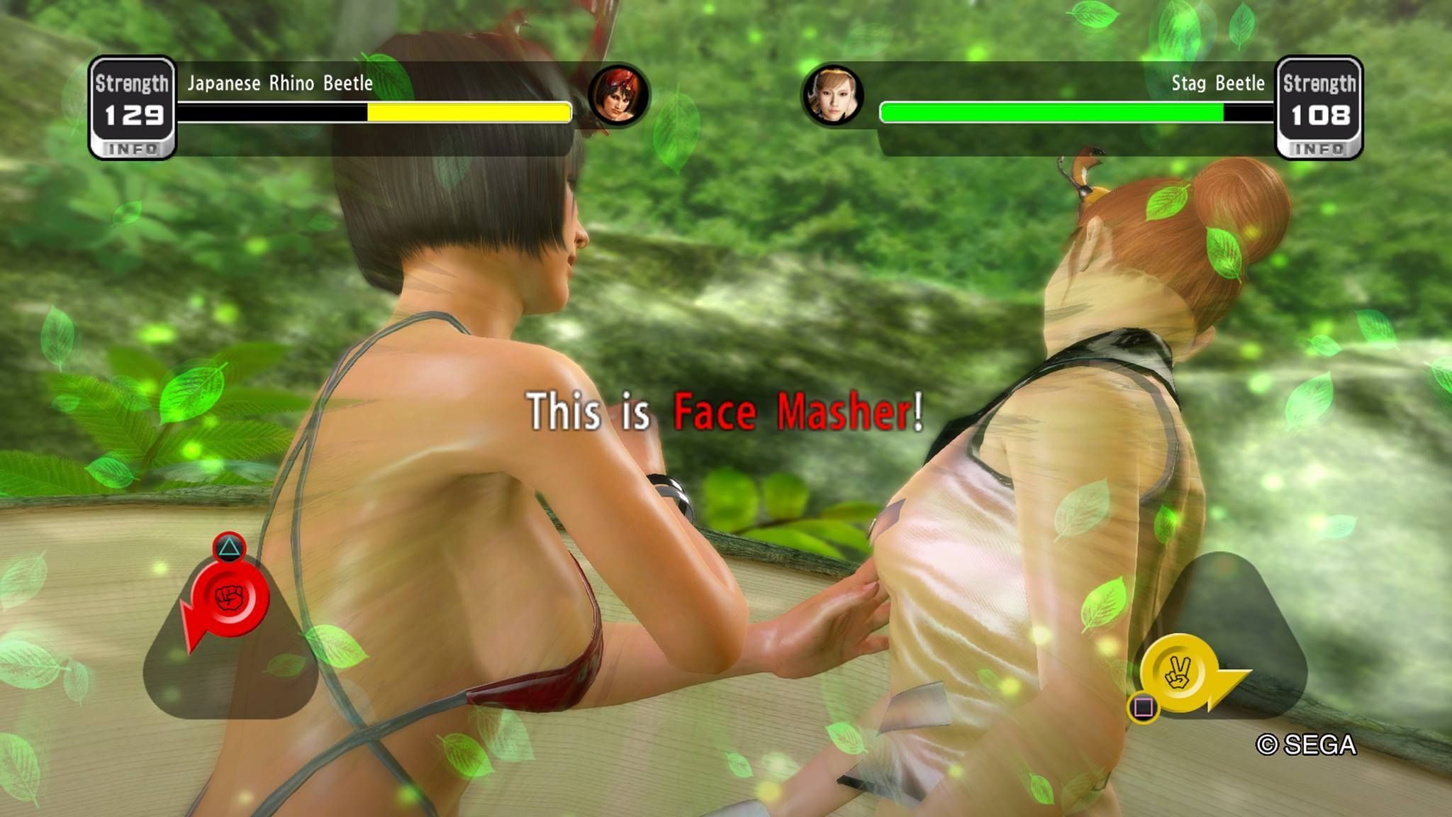 Lo que sí encontraremos en el Club Sega son batallas de Battle Bug Beauties Mesuking, una recreación eroticofestiva del piedra, papel y tijera que está asociada a un nuevo coleccionable de cartas. No depende únicamente de la suerte: los rivales tienen manías y conocer su personalidad ayuda a anticipar sus movimientos favoritos.