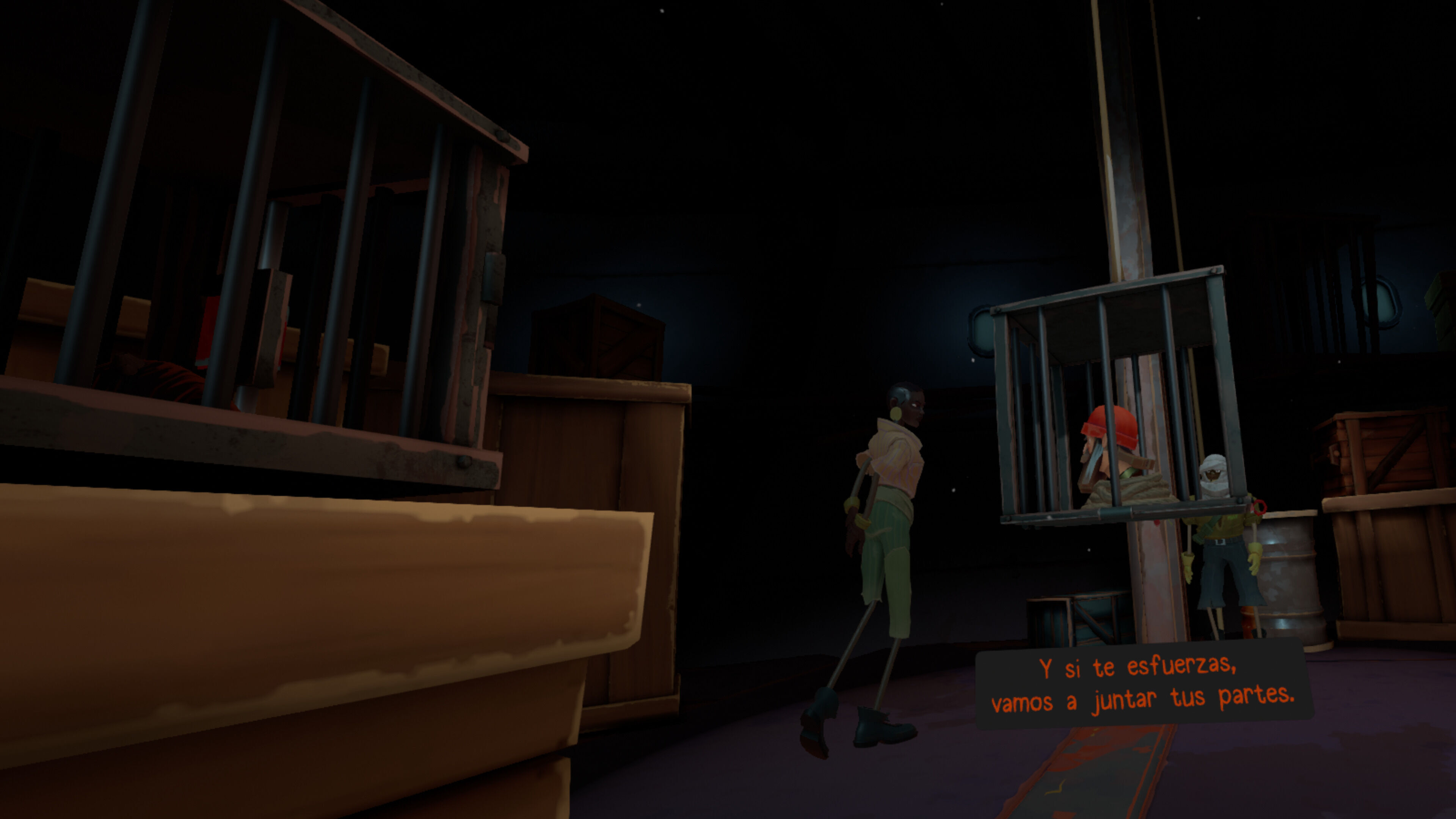 Los puzles como tal no son demasiado difíciles, pero sí que buscan no repetirse. Algunos ejemplos, para que os hagáis una idea (de los dos primeros niveles, para no destripar nada), nos llevan a mirar en las taquillas de unos piratas para identificarlos y saber qué manos usar en un escáner, ir colocando nuestra cabeza en diferentes zonas del escenario para poder guiar nuestra mano hasta un objeto, o conseguir una «mano-grúa» para controlar una grúa de verdad y solucionar un puzle. Como veis, incluso si no vamos a encontrar una gran variedad de manos, sí vamos a encontrar una gran variedad de situaciones en las que utilizarlas.
