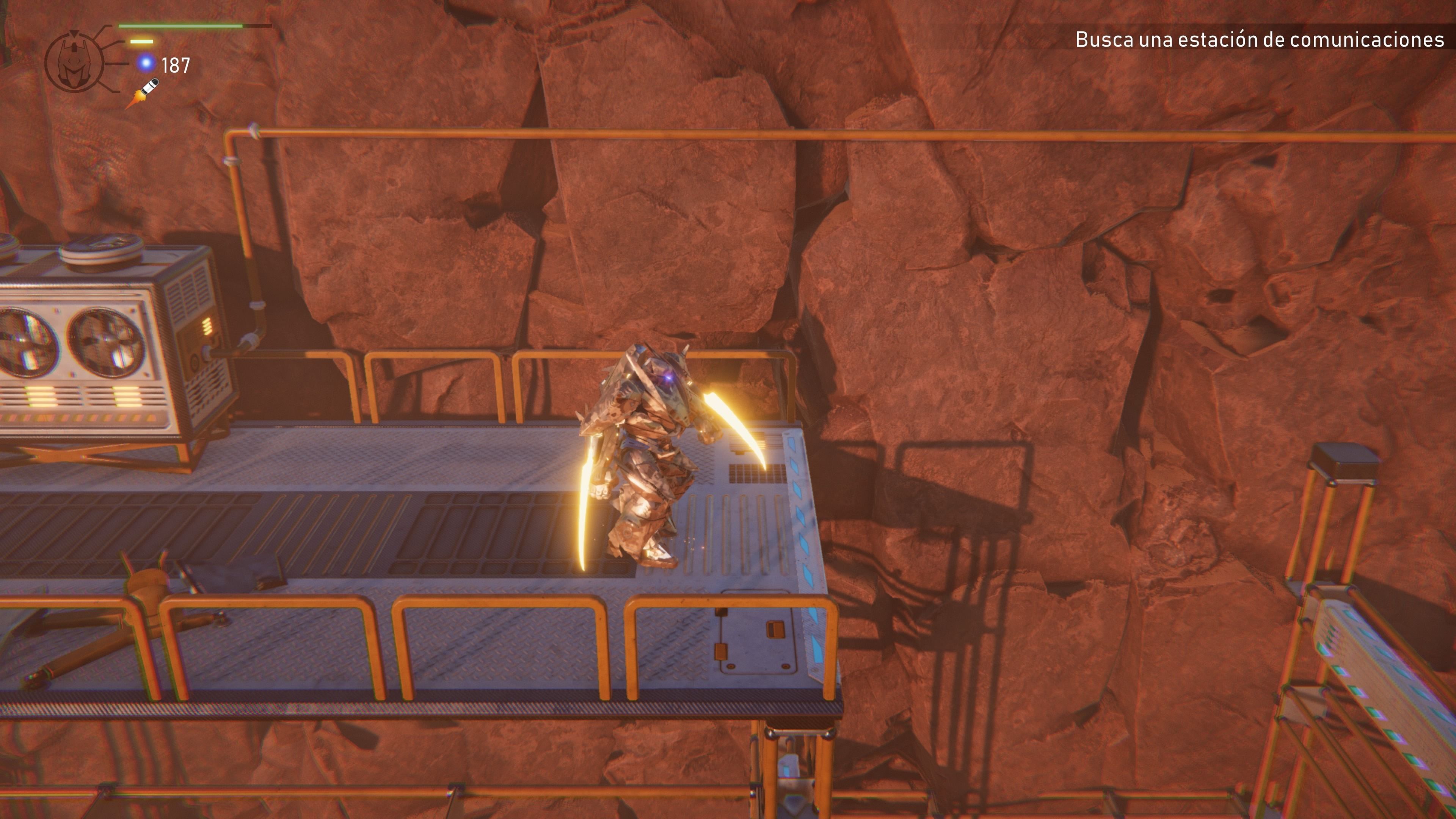 Nuestro mecha dispone de saltos, saltos dobles y posibilidad de escalar algunas estructuras. Esto se aprovecha en zonas con algún tipo de interruptor que funciona durante segundos o para interactuar con la destrucción del entorno –quizás el detalle más trabajado en los gráficos- con la intención de crear un nuevo camino. La lástima es que por diseño un tanto confuso –a veces no está claro qué hacer o a dónde ir, el minimapa no se puede ampliar, no utiliza guías visuales para guiar nuestra atención a lo importante…-, escaso ingenio de pruebas y una cámara que no siempre se coloca bien –a diferencia de los tramos en mazmorras, que es cenital, aquí está más inclinada-, la acción en la superficie del planeta nos ha parecido bastante inferior a los claustrofóbicos pasillos. Un planteamiento similar a lo visto en algunas aventuras de principios de los 2000, tanto en lo bueno como en lo malo, que empaña las virtudes conseguidas en otros aspectos.