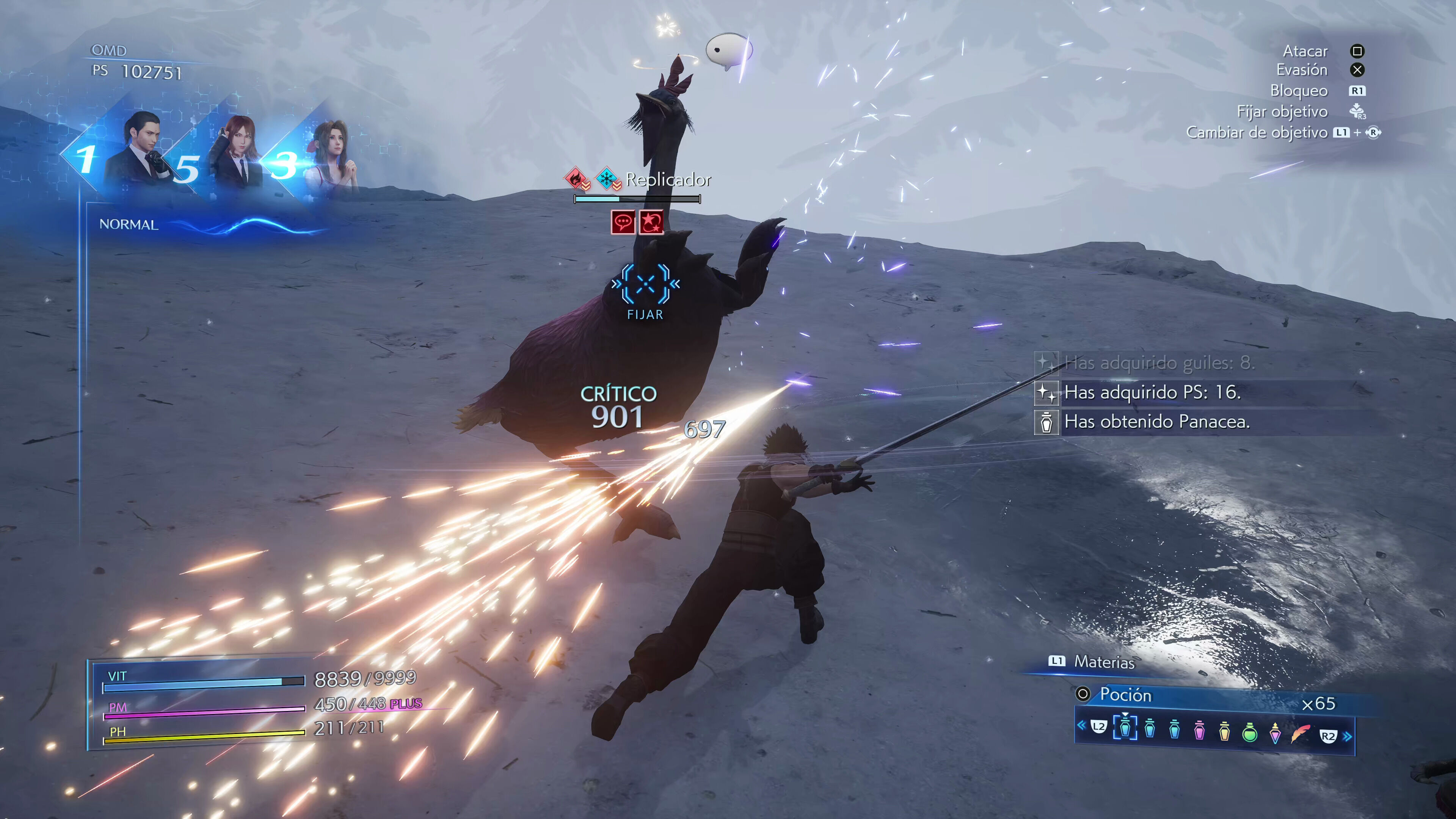 Por suerte, los combates sí que han sufrido una importante renovación que consigue que estemos hablando de un juego muchísimo más disfrutable que nunca. Si en PSP teníamos unas batallas en tiempo real que en realidad camuflaban una especie de intercambio de golpes similar a los turnos, ahora se ha apostado por la acción pura y dura, lo que implica, de entrada, un control de nuestro personaje mucho más ágil. No en vano, ahora Zack puede realizar combos con su espada de un modo similar a como lo hacía Cloud en Final Fantasy VII Remake, puede cancelar acciones para encadenar técnicas y hechizos de un modo muy orgánico y fluido, y maniobras como la esquiva o el bloqueo han ganado muchísima utilidad e importancia.