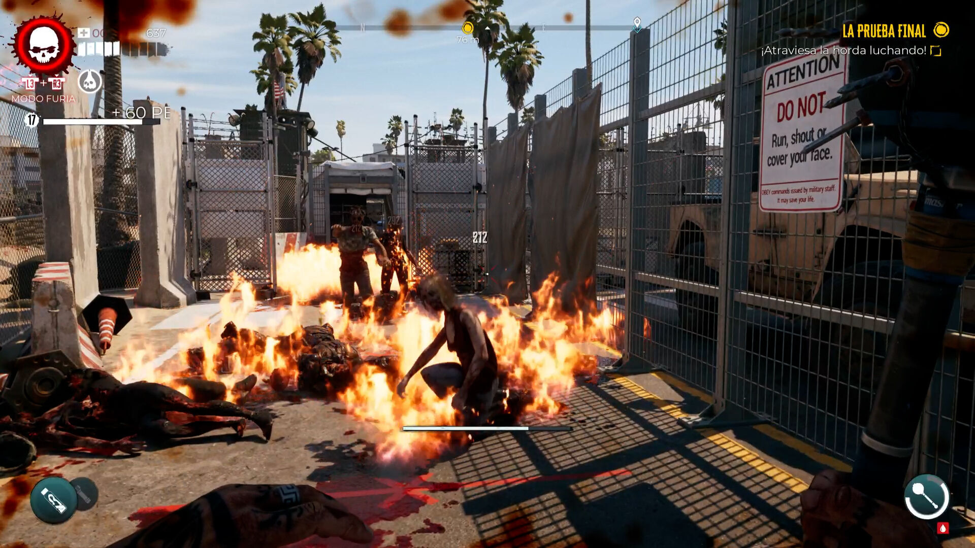 Los elementos son la base sobre la que se sustenta el combate y por el que es creativo. Hay muchos tipos de zombis: algunos más endebles y otros muy rápidos, unos que son frustrantes esponjas de golpes y otros que hay que priorizar porque su grito atrae a más muertos vivientes, y los que explotan, y los que lanzan veneno, y más todavía. Hay variantes de casi todos ellos: los electrificados, los que están en llamas, los que cargan bidones de líquido radioactivo. Todo esto se combina con el diseño de niveles y con los elementos que tenemos por los escenarios: charcos de agua, bidones de gasolina, válvulas que accionar para liberar gas tóxico, baterías, particularidades interactivas de cada escenario y otras cosas que podemos combinar, teniendo en cuenta los elementos de nuestras armas y de los enemigos, con el objetivo de desatar situaciones caóticas y espectaculares que nos permiten quitarnos de encima decenas de zombis.