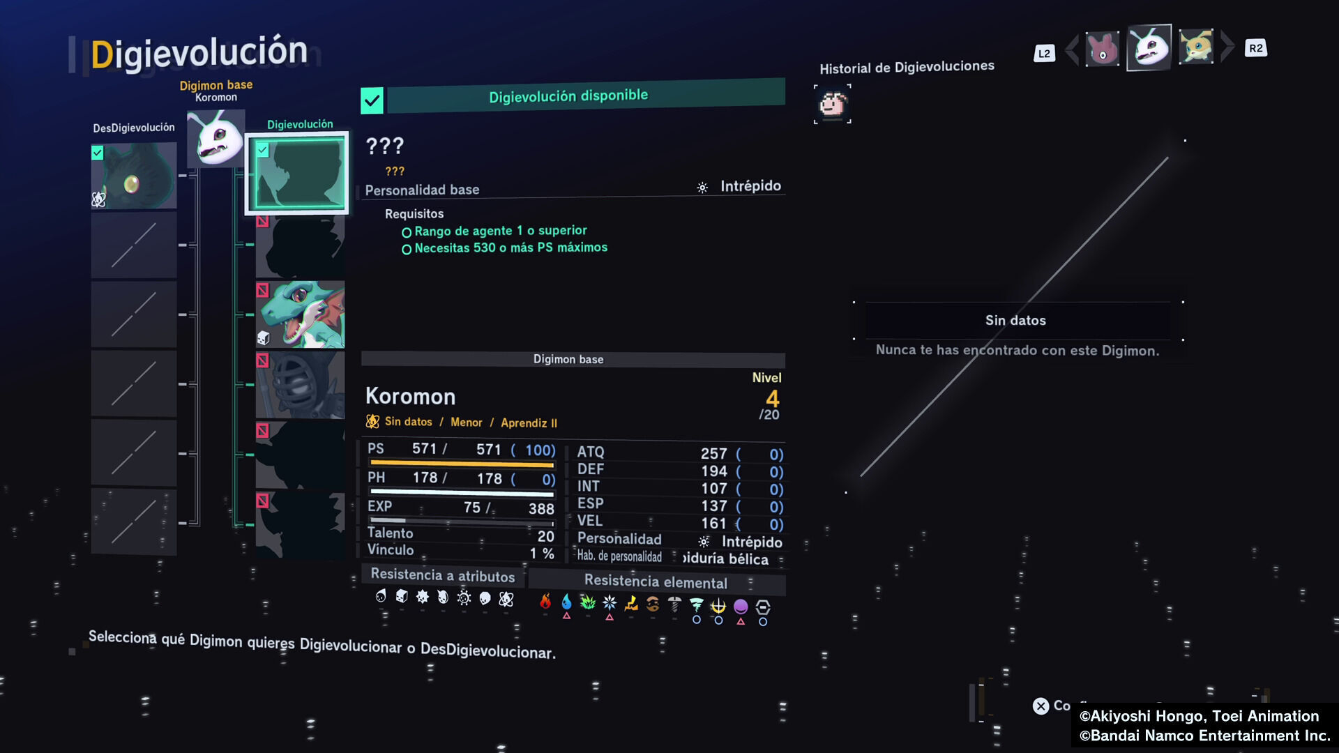 Que un Digimon evolucione a una forma u otra depende de un montón de variables: alcanzar cierta cifra en una o varias estadísticas de la criatura, una personalidad que se puede cambiar de varias maneras y que tiene otro efectos, el nivel de nuestro protagonista y las mejoras hayamos desbloqueado de su extenso árbol de habilidades, e incluso disponer de otros Digimon o de ciertos objetos. Pasaremos mucho tiempo DigiEvolucionando y DesDigievolucionando, gastando con cabeza los consumibles que mejoran las estadísticas, y trasteando en la Digigranja, un lugar virtual personalizable donde podemos hacer que los Digimon entrenen y obtengan materiales mientras consiguen la misma experiencia que si los llevamos en la caja.