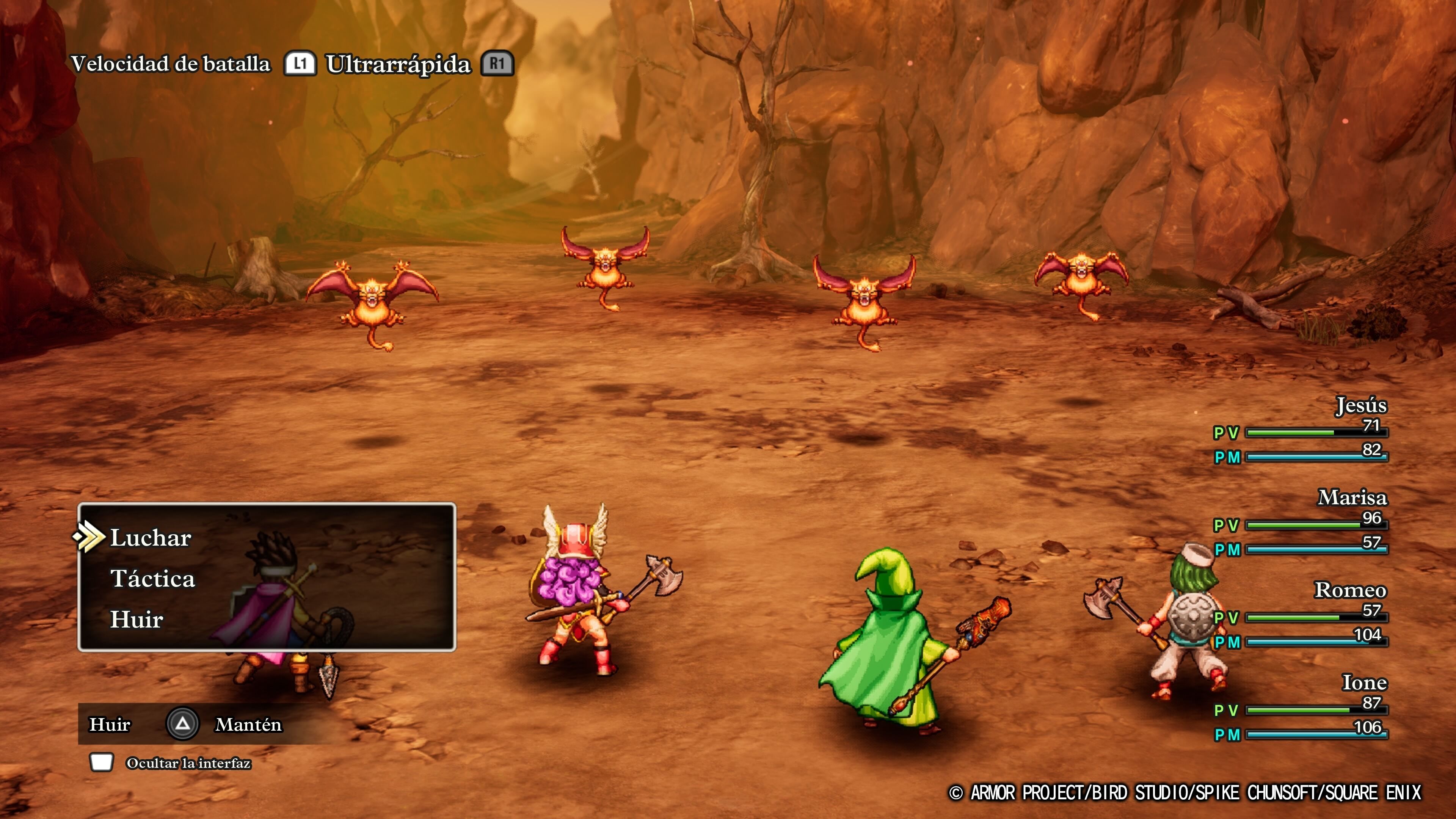 Lo bueno es que podemos modificar la dificultad en cualquier momento por si nuestros animos -y tiempo disponible- cambian en algún momento. También podemos optar por incrementar la velocidad (una opción acertadísima), así como seleccionar la autobatalla, aunque siempre es mejor apostar por escoger los comandos en cada turno para vivir una experiencia cien por cien Dragon Quest. Aparte de esto, tienes autoguardado, a pesar de que el propio videojuego te recomienda que tú también hagas guardados manuales a través de los 9 slots existentes.