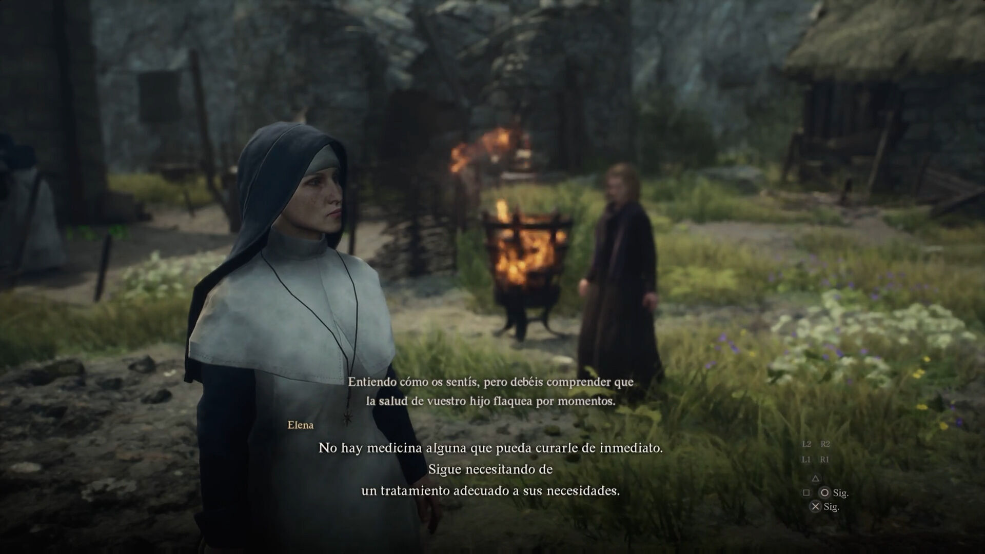 El mensaje está claro: quiere que andes, pues aquí no hay monturas, una y otra vez por sus caminos, aunque ya hayas pasado por ellos. Te anima a perderte, a que te fijes en esas estatuas que apuntan a algún secreto y a que te ocurran un montón de cosas que no están predeterminadas. Pero con cuidado: cuando llega la noche, de las más oscuras que jamás hemos visto en un videojuego, el mundo es aún más peligroso, por lo que es recomendable buscar una hoguera en la que acampar o una posada en la que descansar, algo necesario para restaurar la vida máxima, siempre teniendo en cuenta que el paso del tiempo puede afectar a algunas misiones.