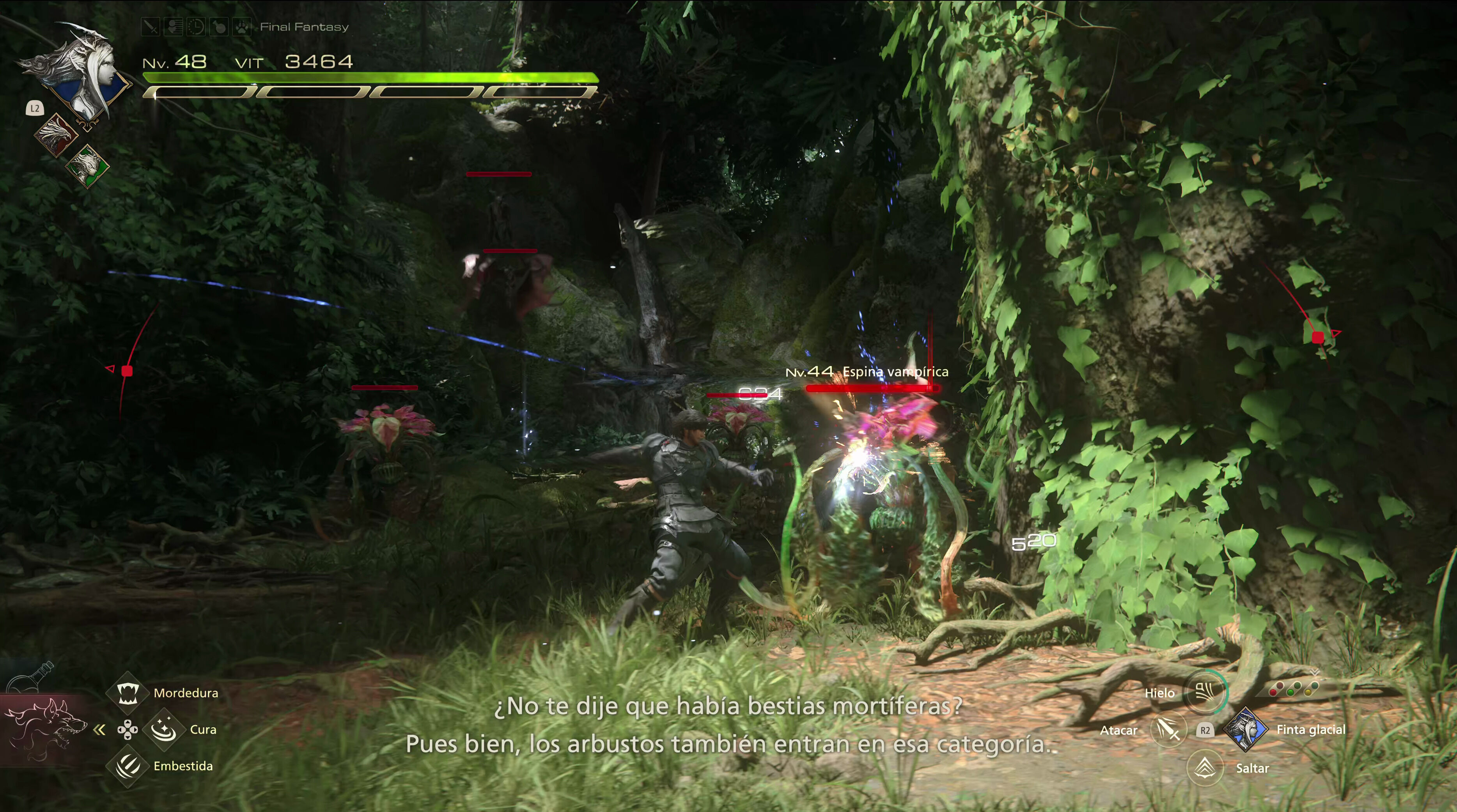La buena noticia es que el sistema de combate es sensacional y funciona de maravilla, permitiéndonos disfrutar de unos enfrentamientos divertidísimos, muy espectaculares y con una puesta en escena de lujo. Para luchar contaremos con un botón para atacar cuerpo a cuerpo y realizar un combo básico, otro para lanzar hechizos a distancia, uno más para esquivar, otro más para la acción única de nuestro Eikon y un último para saltar.