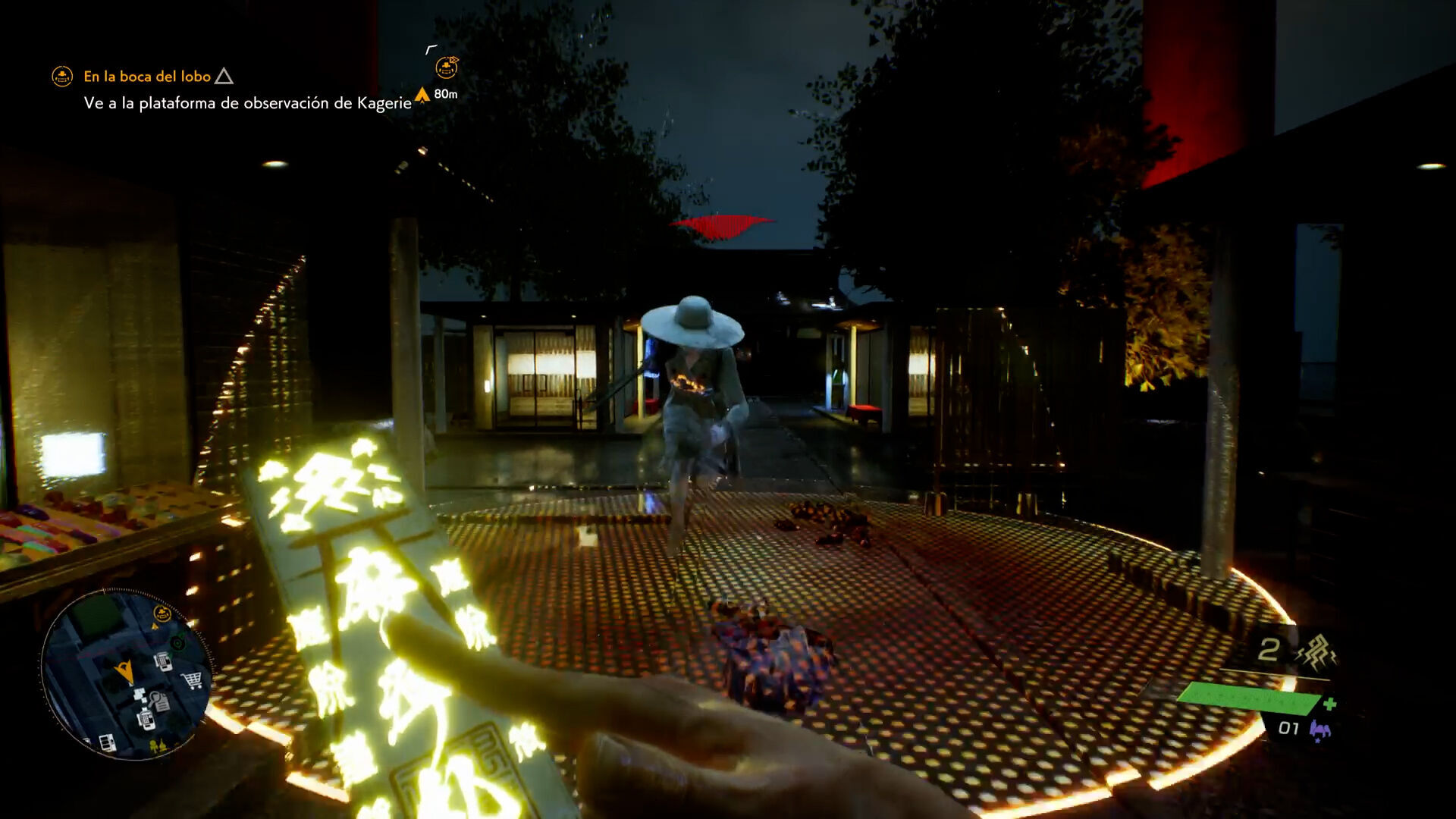 También hay que tener en cuenta la verticalidad de la ciudad. Durante las primeras horas de juego exploramos solo callejeando, a veces colándonos en edificios, parques y zonas de obras. Quizá por costumbre o quizá por cómo nos llaman los neones, se nos olvida mirar hacia arriba. Hasta que lo hacemos. Los tejados de Shibuya están repletos de tengu, yokais a los que podemos agarrarnos para impulsarnos hasta la cima de los edificios, plagados de dinero, espíritus, coleccionables, puertas torii y accesos a zonas inaccesibles de otro modo. Desplazarnos por las alturas de los bloques de pisos, los rascacielos y las casas se percibe por momentos como un juego de plataformas, y utilizar el planeo para saltar de un edificio a otro o para bajar a pie de calle hasta nuestro objetivo es tremendamente satisfactorio.