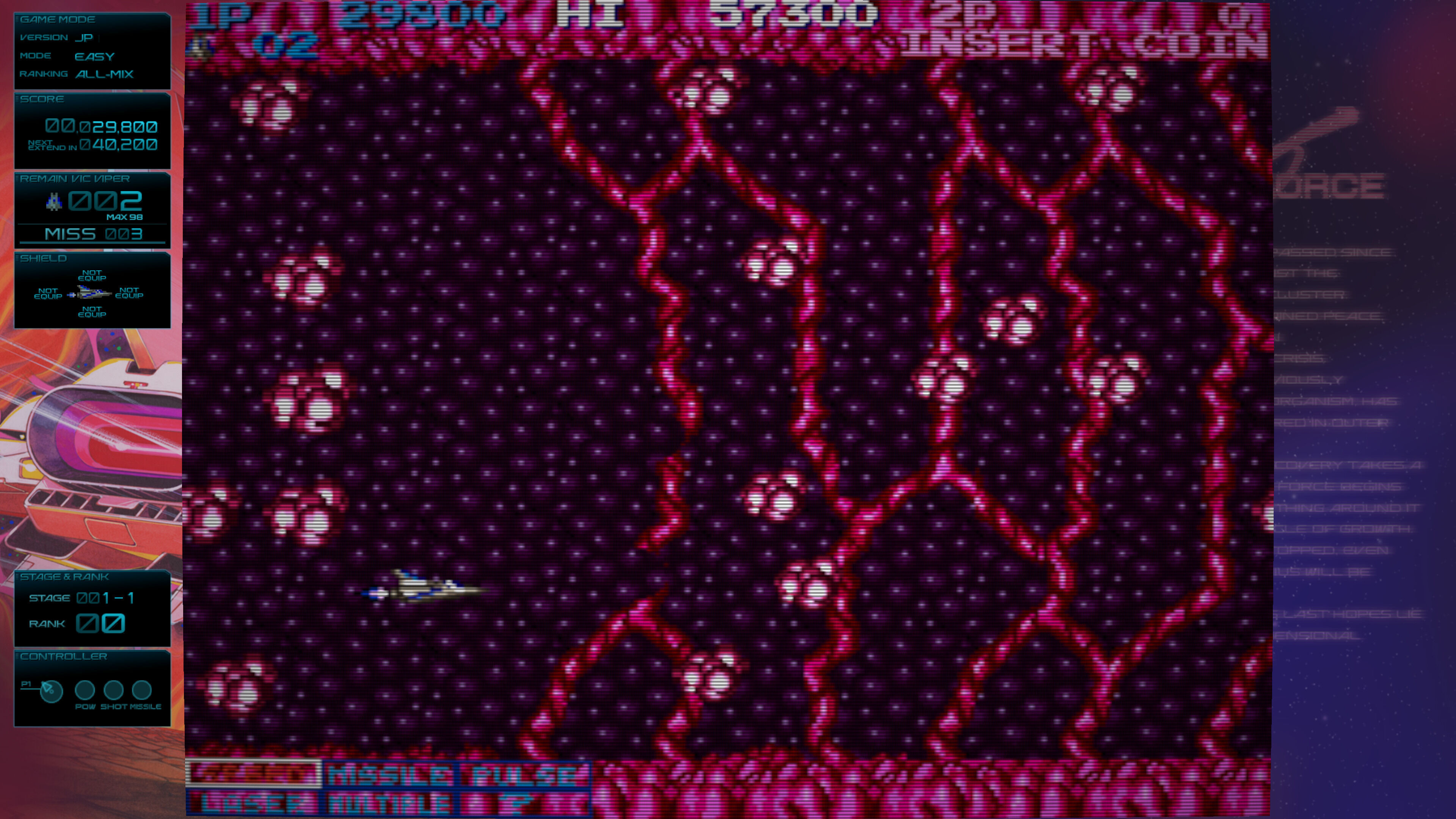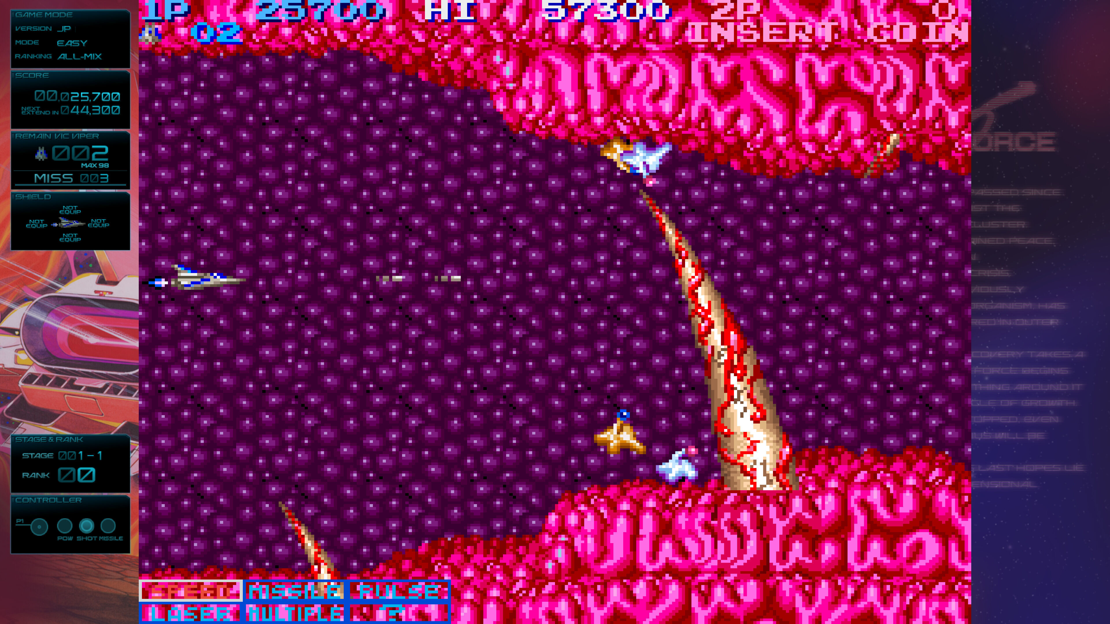 No profundizaremos mucho en los juegos clásicos o las diferencias de gestión en los potenciadores entre Gradius y Salamander, pero merece la pena destacar alguna rareza como Gradius 3 en su versión AM Show. Y es cierto que el fan de Konami quizás encuentre que parte de este catálogo se superpone con el de Arcade Classics Anniversary Collection (2019), que contenía Nemesis, Salamander y Vulcan Venture (Gradius II), pero aquel recopilatorio era bastante mejorable por la calidad de la emulación, escasas mejoras y lo flojos que eran ciertos juegos incluidos.