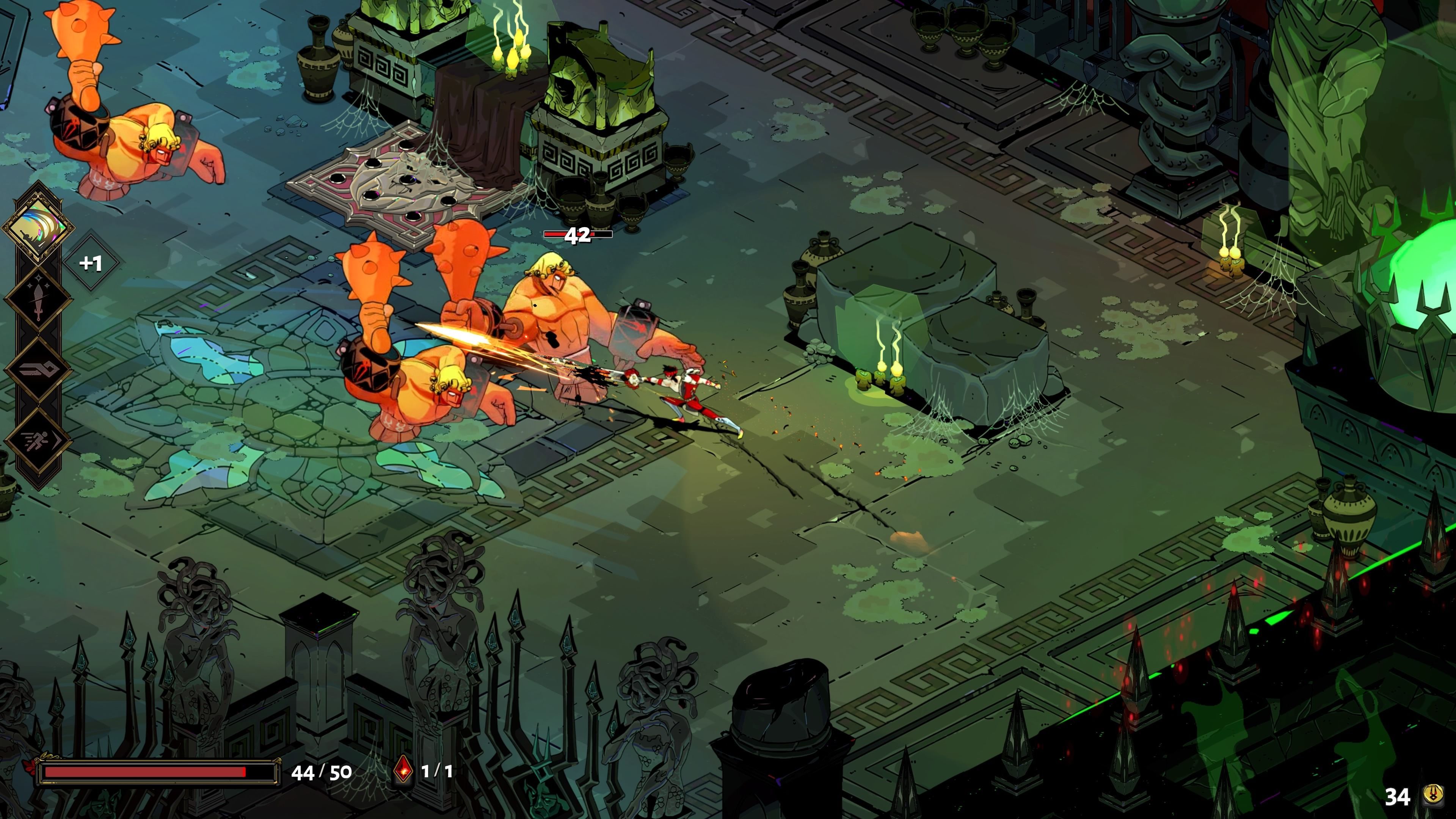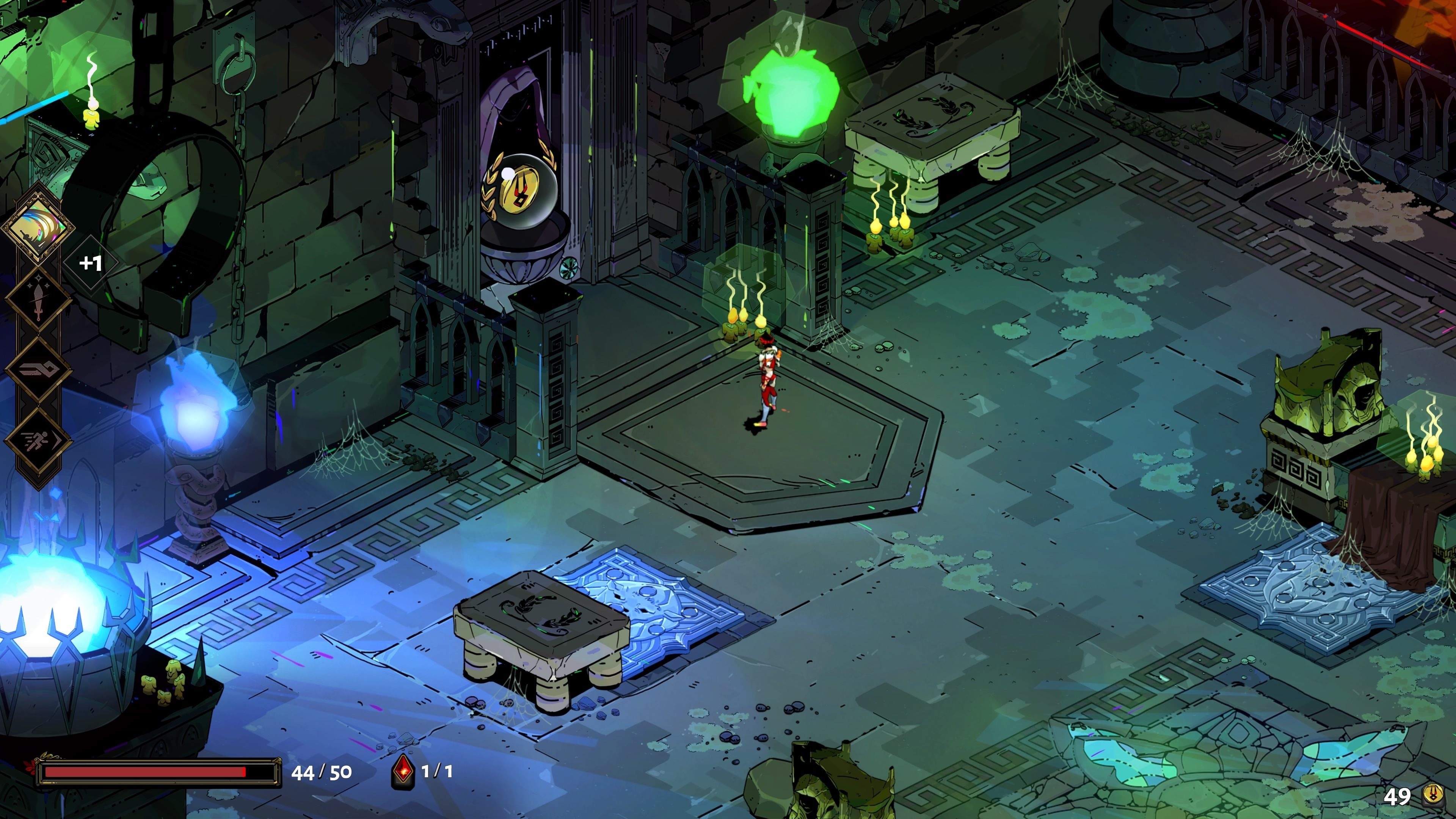 Cada vez que comenzamos un nuevo intento de abandonar el Inframundo, nos toca recorrer un buen número de diferentes salas que se generan de manera procedural. Unas estancias que están agrupadas en distintos niveles y que tenemos que limpiar de adversarios para poder acceder a la siguiente. Y cada vez que realicemos esto, seremos recompensados con una nueva habilidad temporal, una llave, una especie de cristales que actúan como moneda, etc. El número de monstruos que nos aguardan en cada habitación es muy variable, casi tanto como sus distintas formas. El bestiario del que hace gala este título es bastante llamativo en general y para tratar de recibir la menor cantidad de daño posible antes de abandonar cada sala, es muy necesario aprenderse los patrones de movimientos y ataque de cada enemigo. Y lejos de tratarse de una tarea ardua y aburrida, lo cierto es que es todo lo contrario.