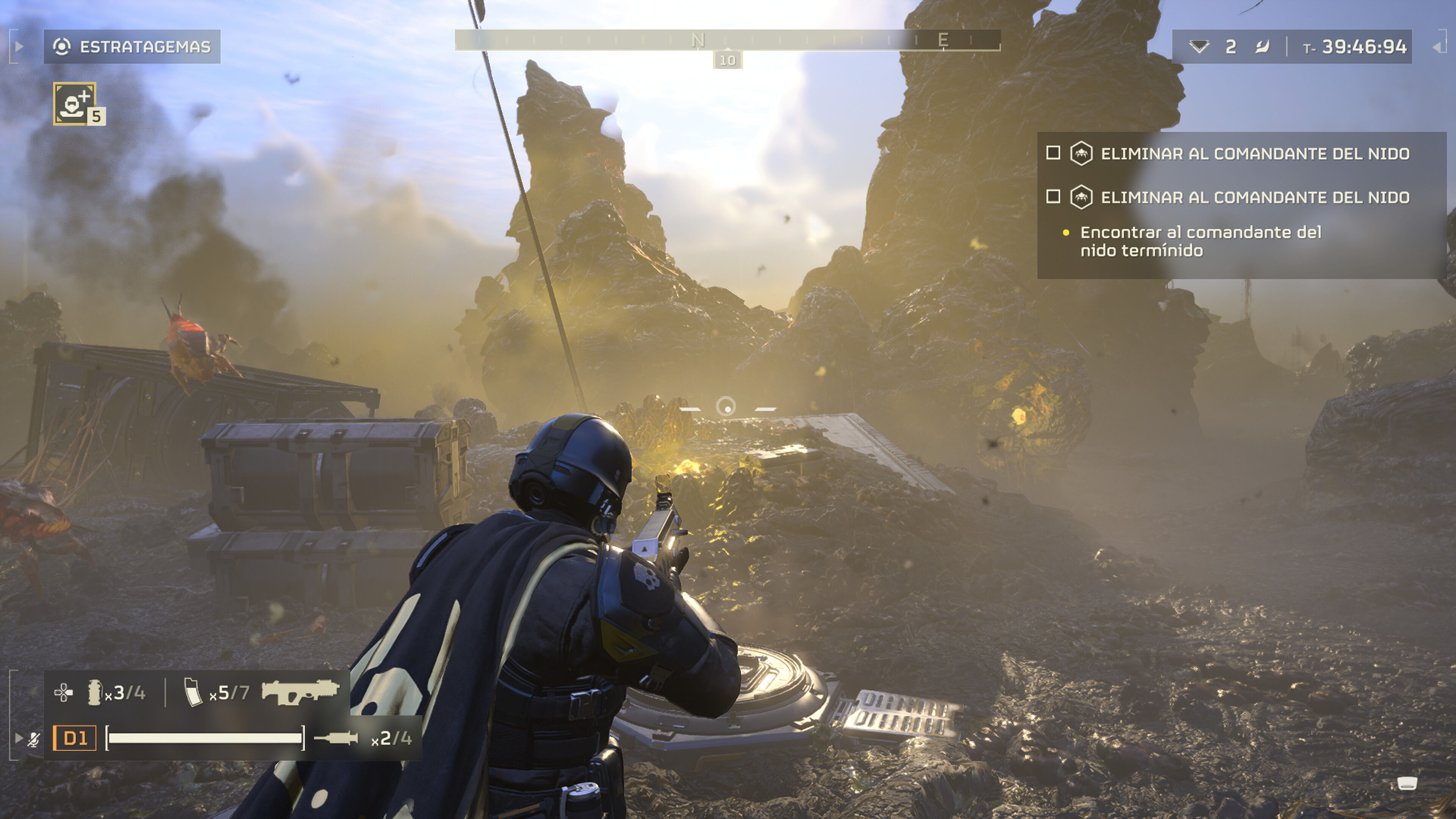 Helldivers 2 engancha y es terriblemente divertido con aliados. Aunque puedes jugar en solitario, la coordinación que se consigue con compañeros siempre facilita afrontar cada situación. Está el riesgo del fuego amigo activado –no deberías lanzar todos tus ataques orbitales sin pensar- pero un escuadrón controla mejor el campo de batalla, coordina las estratagemas –todos se benefician de la munición o armas caídas del cielo- y se puede atender a todos los flancos; es un juego en el que es fácil que tu plan se eche al traste y la batalla campal se convierta en puro caos, rodeado de enemigos "menores" mientras en el horizonte aparecen dos o tres criaturas blindadas. Por suerte, además de varios niveles de dificultad –a más nivel, mejores recompensas- dispones de un puñado de oportunidades antes de dar por terminada la misión: los personajes son prescindibles para el sistema y se sustituyen inmediatamente por otro recluta.