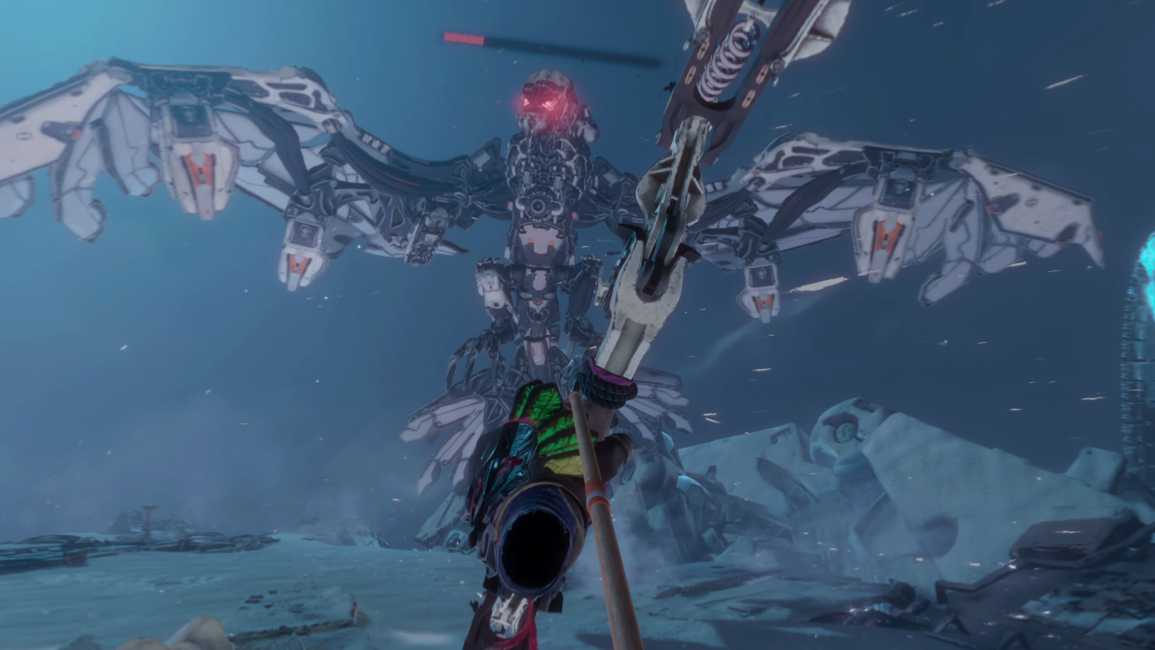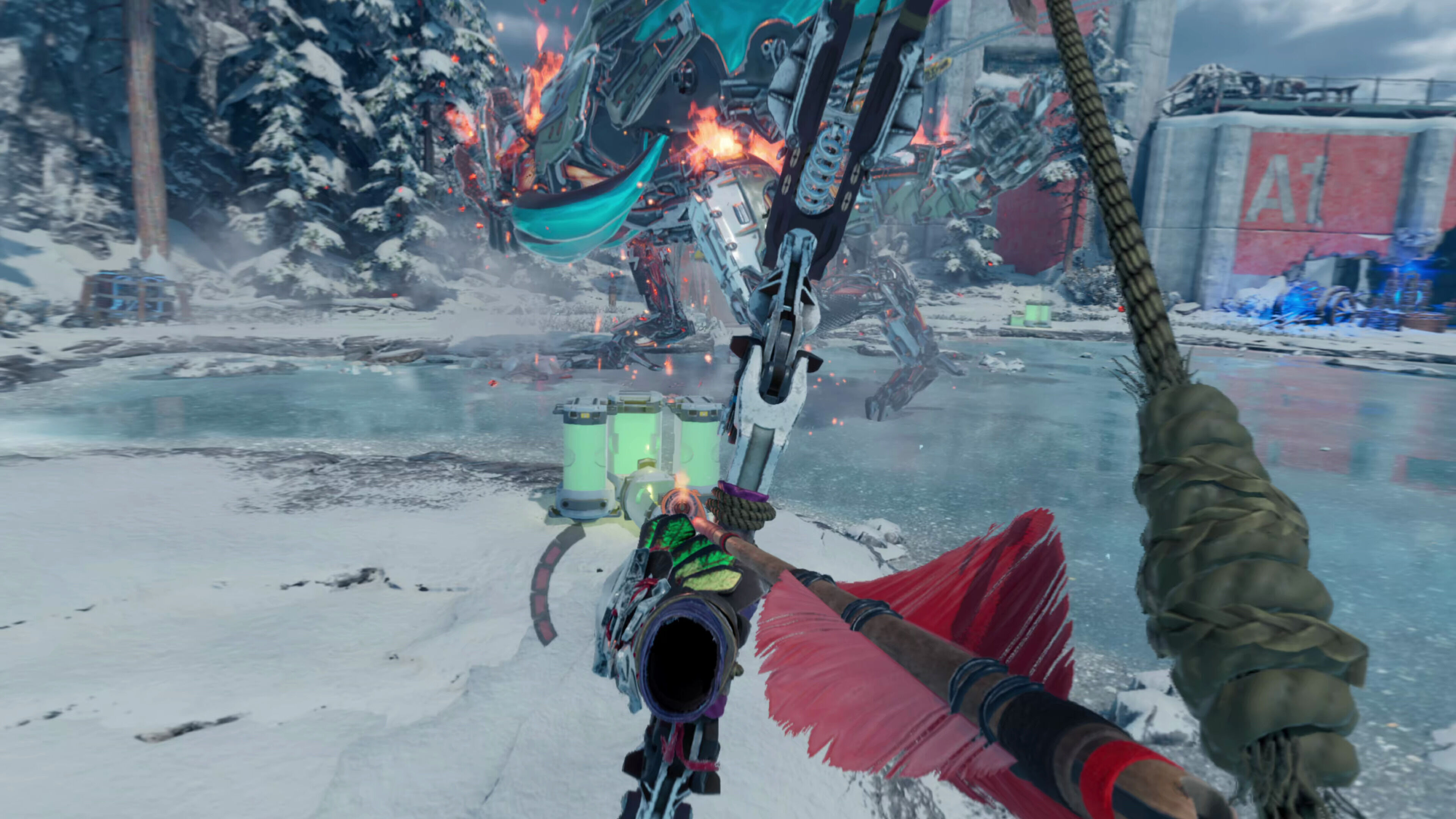Al igual que en las dos entregas principales de la saga, nos tocará hacer frente a grandes criaturas mecánicas haciendo uso de nuestro arco y de diferentes tipos de flechas, aunque el desarrollo de las batallas es mucho más simple y únicamente nos tendremos que preocupar de apuntar, disparar y esquivar hacia los lados. El apuntado es completamente manual, así que tendremos que sujetar el arco con una mano mientras tensamos la cuerda con la otra con las flechas que saquemos de nuestro carcaj virtual, algo que resulta divertidísimo y que requiere que afinemos bien cada disparo.