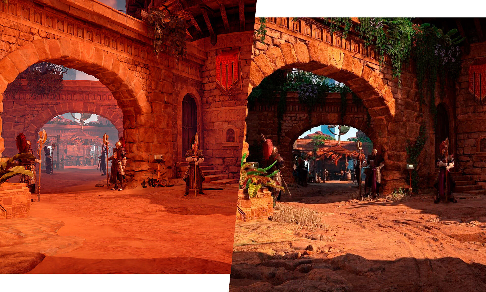 Además no se han trasladado materiales y terrenos tal cual de Forbidden West a Zero Dawn, no siempre tendría sentido; esa base luego se ha adaptado o se han crearon nuevas texturas en alta resolución para acercarlo a la estética original.