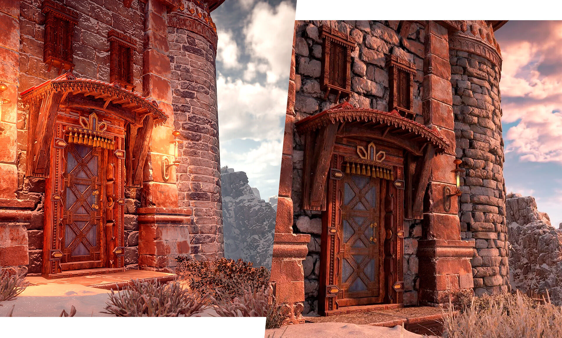 En la ambientación, Zero Dawn actualiza la iluminación por la de la secuela -para los biomas y cada localización, sea abierta o cerrada, y para los primeros planos en cinemáticas o diálogos-, expande la deformación de la nieve fuera de The Frozen Wilds, se integran las nubes volumétricas de Burning Shores, la expansión de Forbidden West, y el agua ahora da una mejor impresión; este elemento, poco importante en el primer Horizon, estaba un poco descuidado hasta que Death Stranding y Forbidden West exigieron una evolución en Decima Engine.