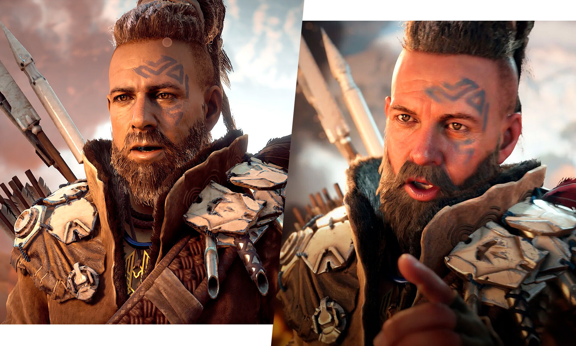 El Decima Engine actual, y que ahora esté pensado para PS5 y PC, trae mejoras en aquellos puntos débiles de Zero Dawn, algunos ya señalados en su momento. Ahora las poblaciones muestran más NPC que además ganan rutinas horarias, y todos los personajes mantienen el nivel de calidad visto en su secuela, lo que no se reducir al tema de polígonos: ahora la piel parece piel y no plástico. La escasa expresividad durante los diálogos era aceptable para un RPG pero no tanto para un juego que muchos consideran más aventura de acción que rol -The Frozen Wilds ya empezó a mejorar este apartado-, así que se han aprovechado 10 horas de datos de captura de movimientos para dar más personalidad y gesticulación. No, no es exactamente la calidad de Forbidden West, pero maquilla el resultado lo suficiente para que pierda el "efecto maniquí".