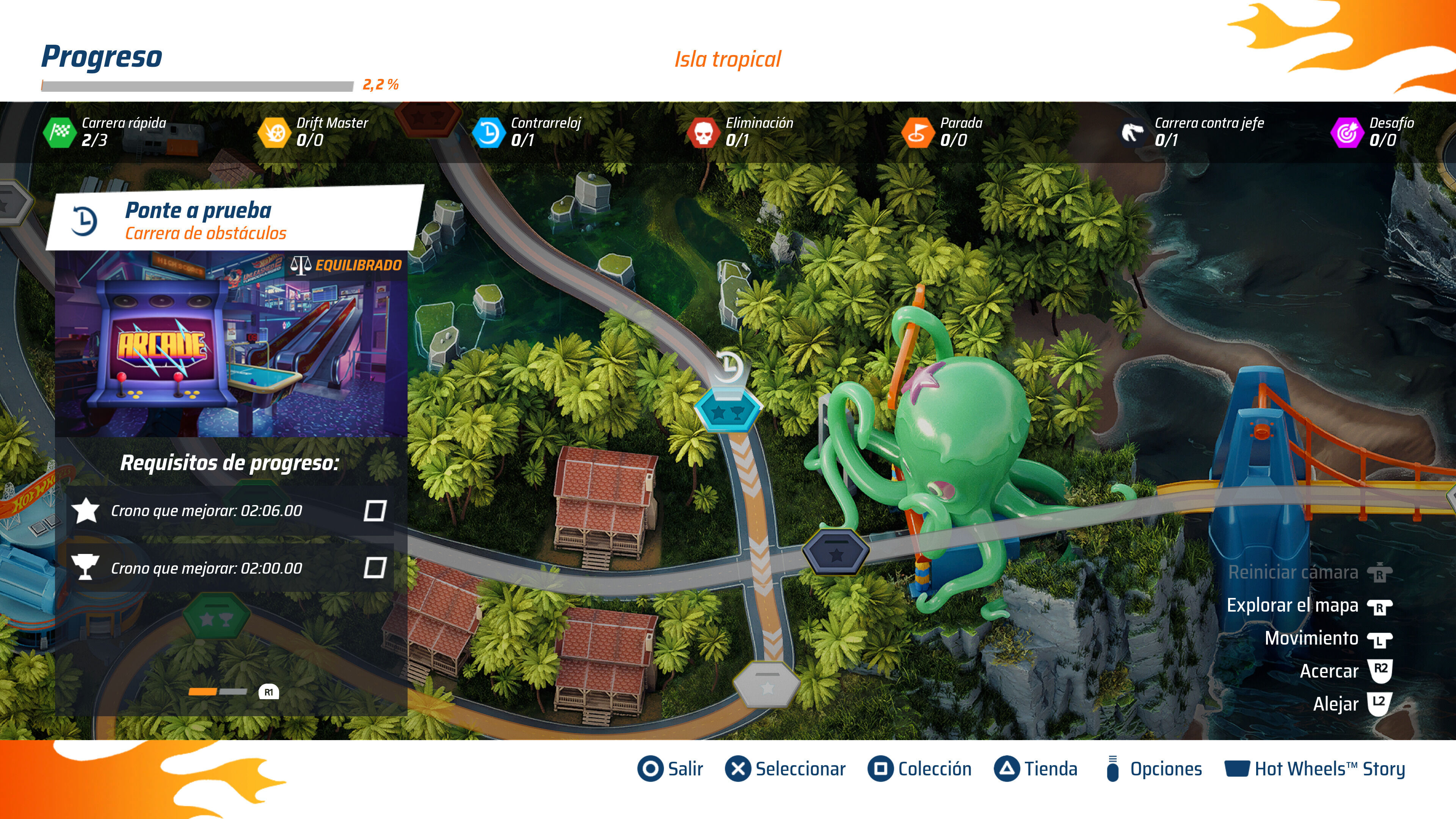 Otra de las novedades de la secuela es que ahora su campaña no es la fría red de nodos que teníamos en el primer juego, sino que se cuenta una pequeña historia –voces en español- con personajes y una amenaza, Hot Wheels Creature Rampage. En la práctica no es que sea una gran diferencia –seguir una ruta con las pruebas-, pero las secuencias intercaladas de cómic animado pueden gustar a los más pequeños de la casa. Milestone aquí está equilibrando el atractivo del juego para todo tipo de público y no descuida que un gran porcentaje de fans de Hot Wheels serán niños.
