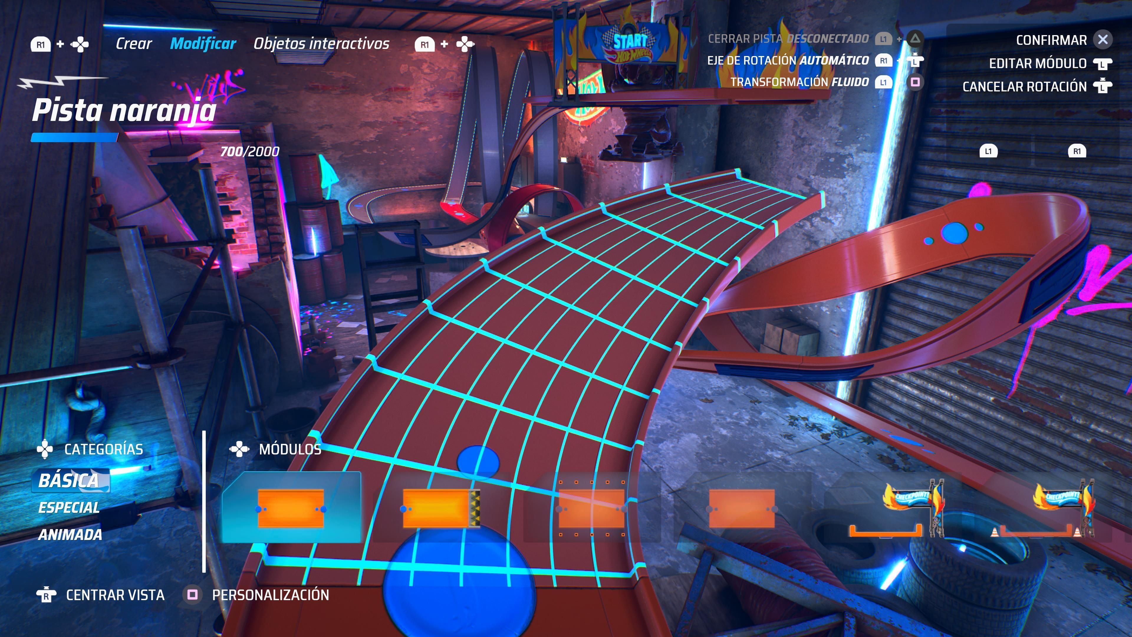 Donde Hot Wheels Unleashed cumple sobradamente con lo que podríamos esperar es en su editor de circuitos, con el que puedes crear tu pista de ensueño. Probablemente conocerás este tipo de editores de otros juegos o incluso géneros: conectar piezas, crear las curvas, añadir los obstáculos, etc. Es bastante intuitivo aunque una cosa es construir una pista y otra diseñar una pista realmente emocionante, para lo que se necesita experiencia y dedicación. Quienes disfruten del juego podrán sacarle mucho partido más allá de la campaña y los circuitos "oficiales".
