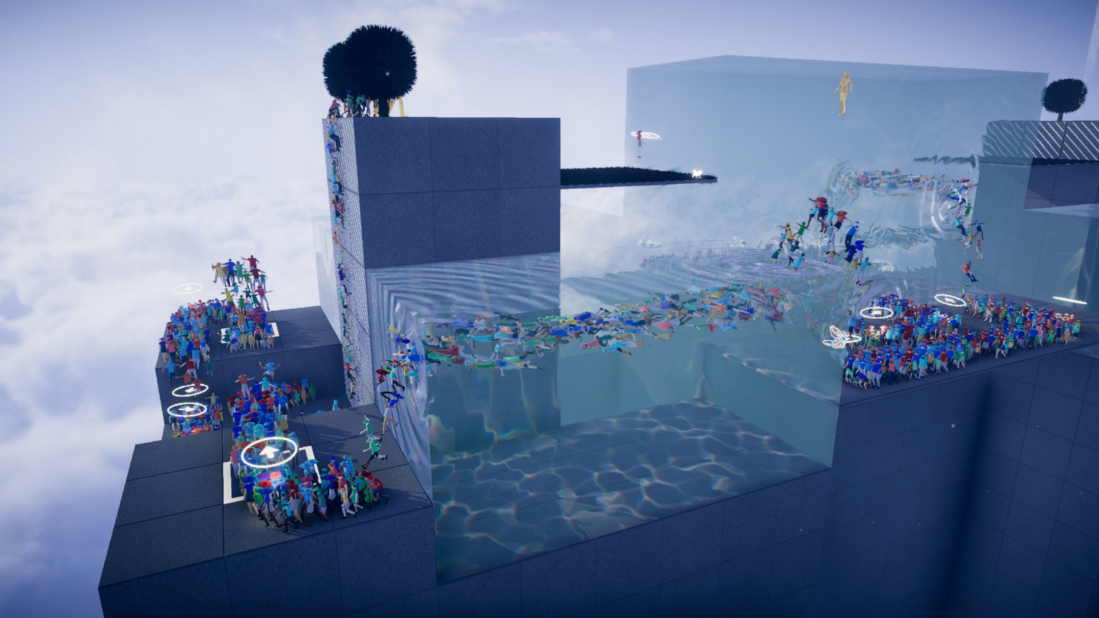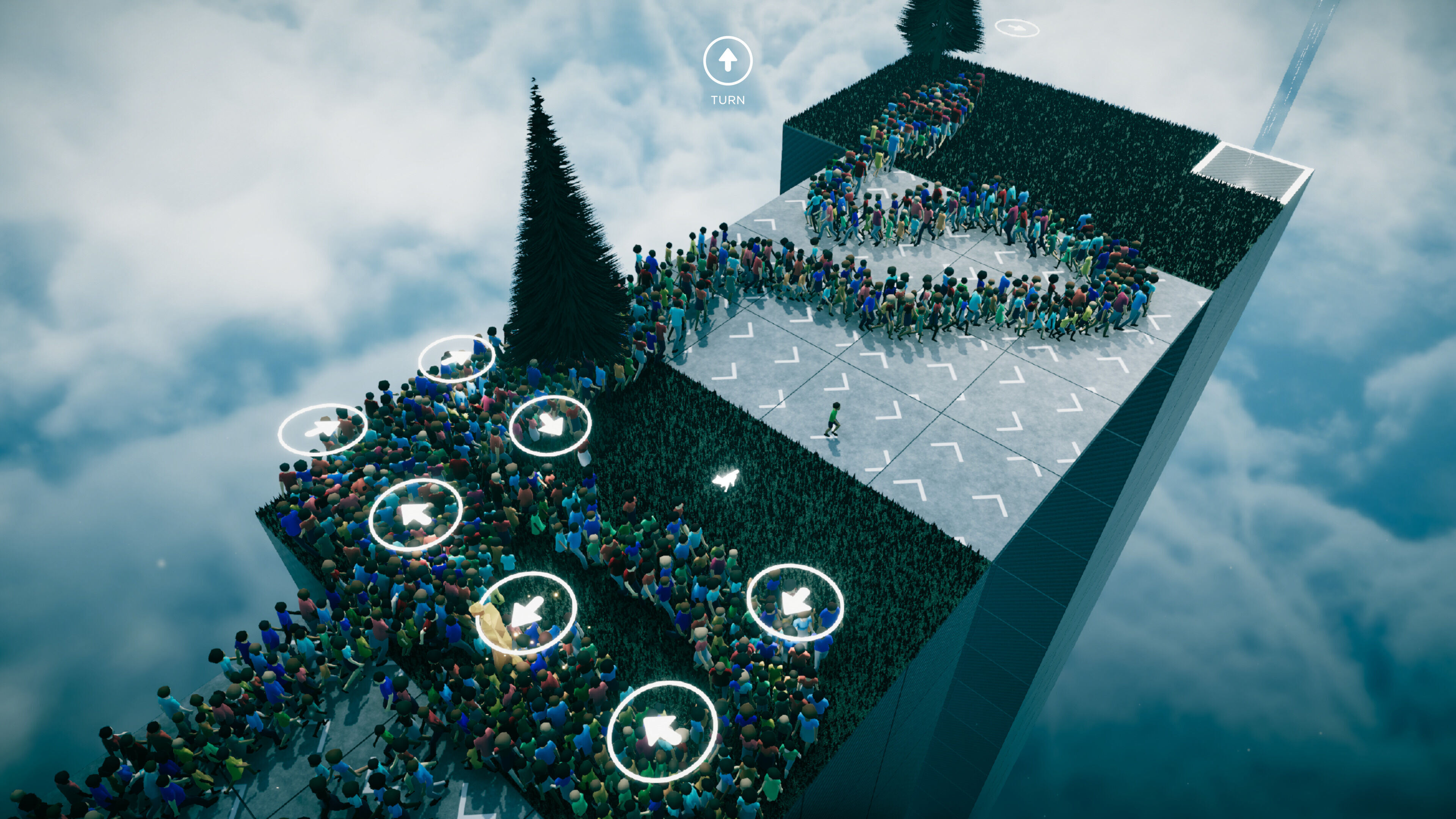 En Humanity, nuestro perro protagonista es el encargado de recorrer el escenario colocando instrucciones en el suelo que harán que el incesante flujo de personas se muevan por el entorno 3D hasta llegar al punto de evacuación. Así, podremos colocar flechas que cambiarán su dirección o que dividirán la fila en dos, saltos de diferentes tipos (más bajos, más altos, más largos…) y algunas sorpresas más que no queremos destripar.