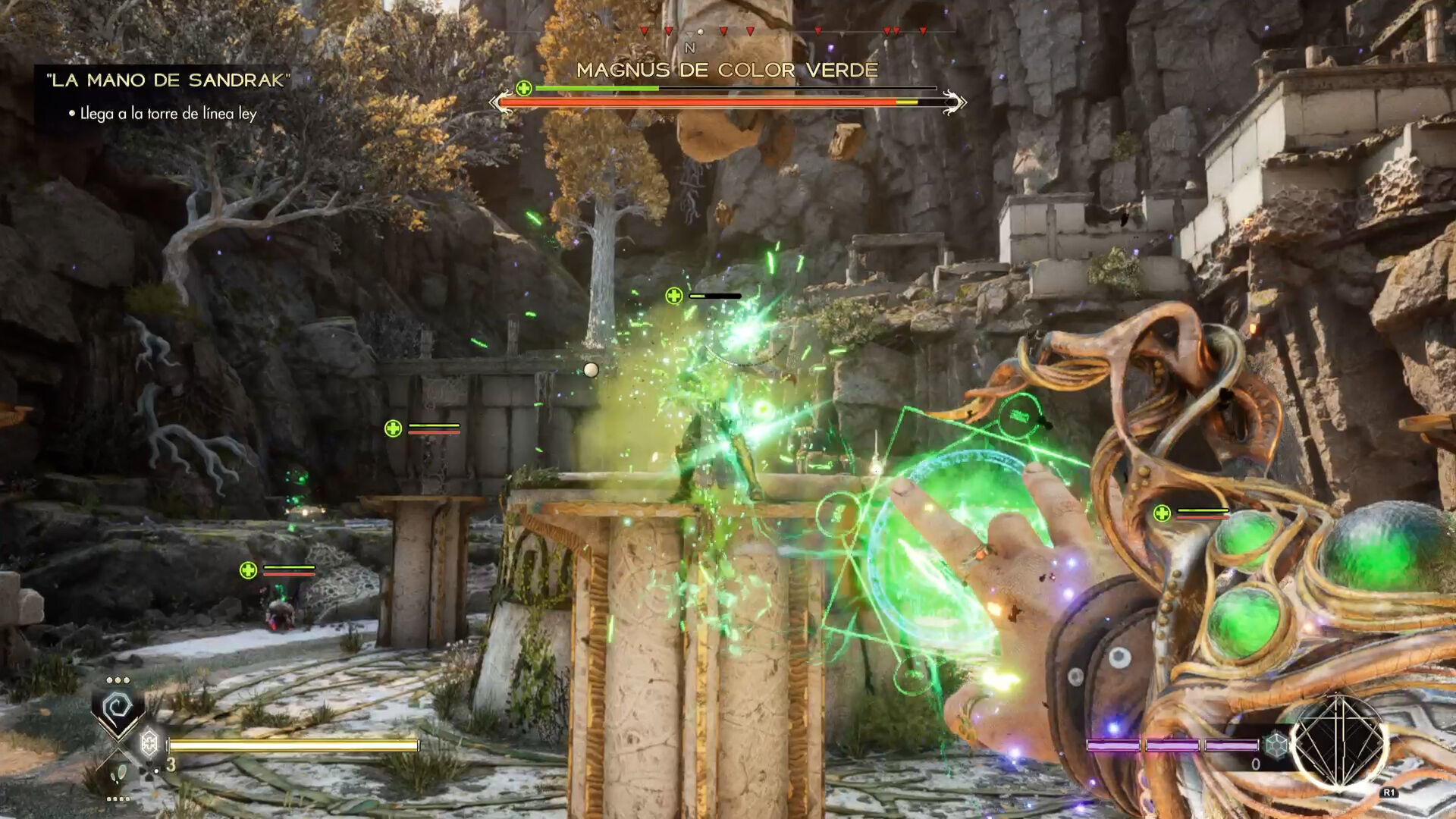 Donde hay momentos en los que Immortals of Aveum brilla es en el combate, donde tenemos un montón de herramientas que obtenemos paulatinamente conforme avanzamos en la campaña, y cuya manera de utilizarlas podemos personalizar con piezas de armadura y con un árbol de habilidades pasivas simple pero efectivo. Tenemos, de primeras, los tres tipos de magia, que en efecto son tres armas distintas: la verde es un subfusil, la roja es una escopeta y la azul es un fusil a distancia; según el guantelete que hayamos equipado para cada una varía el daño, la cadencia y la munición infinita.